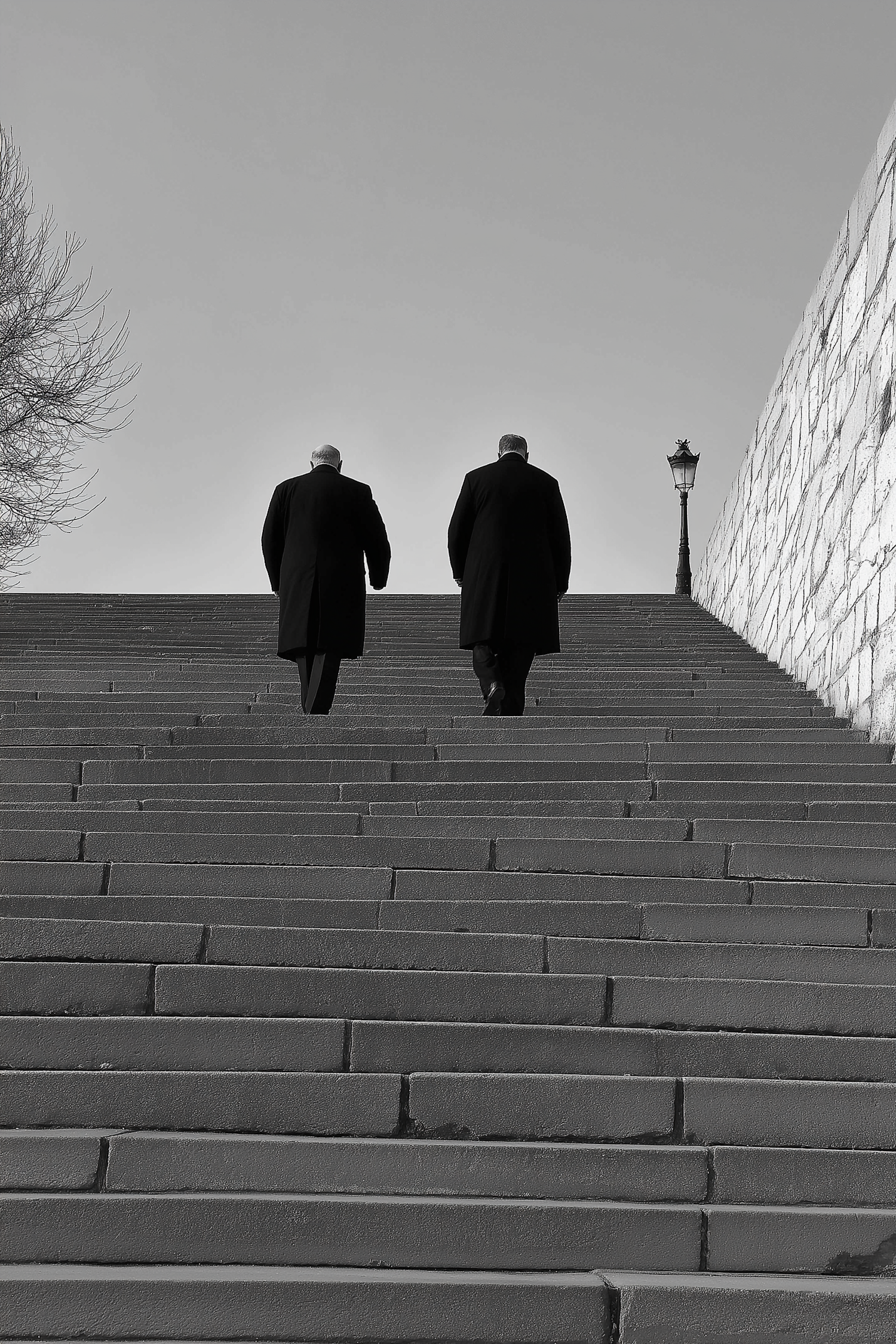 Two elderly men in dark coats walk up stone steps under an overcast sky, with a vintage street lamp and bare tree adding to the scene's mood.