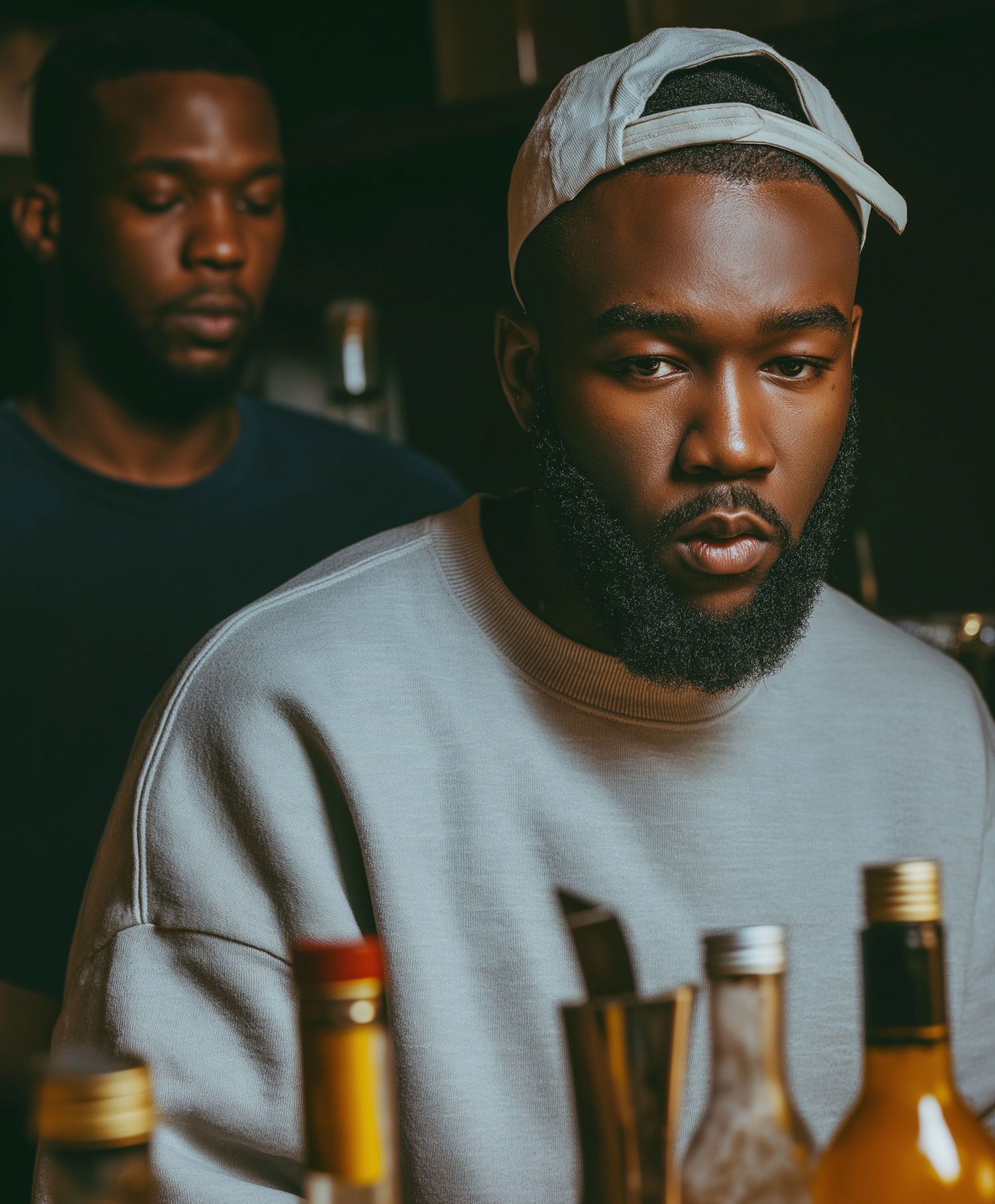 A close-up shot of two men, one focused in the foreground with a white cap, set against a dimly lit background, with bottles on a surface.