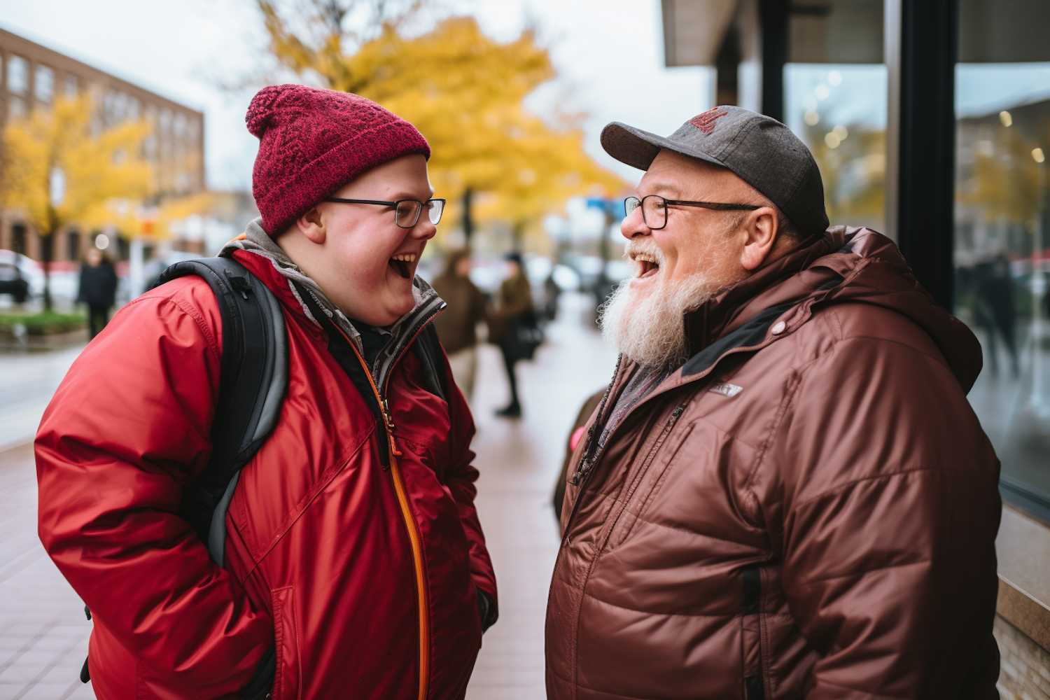 Two people laughing together on a city sidewalk, wearing warm jackets and hats, with autumn trees in the background.