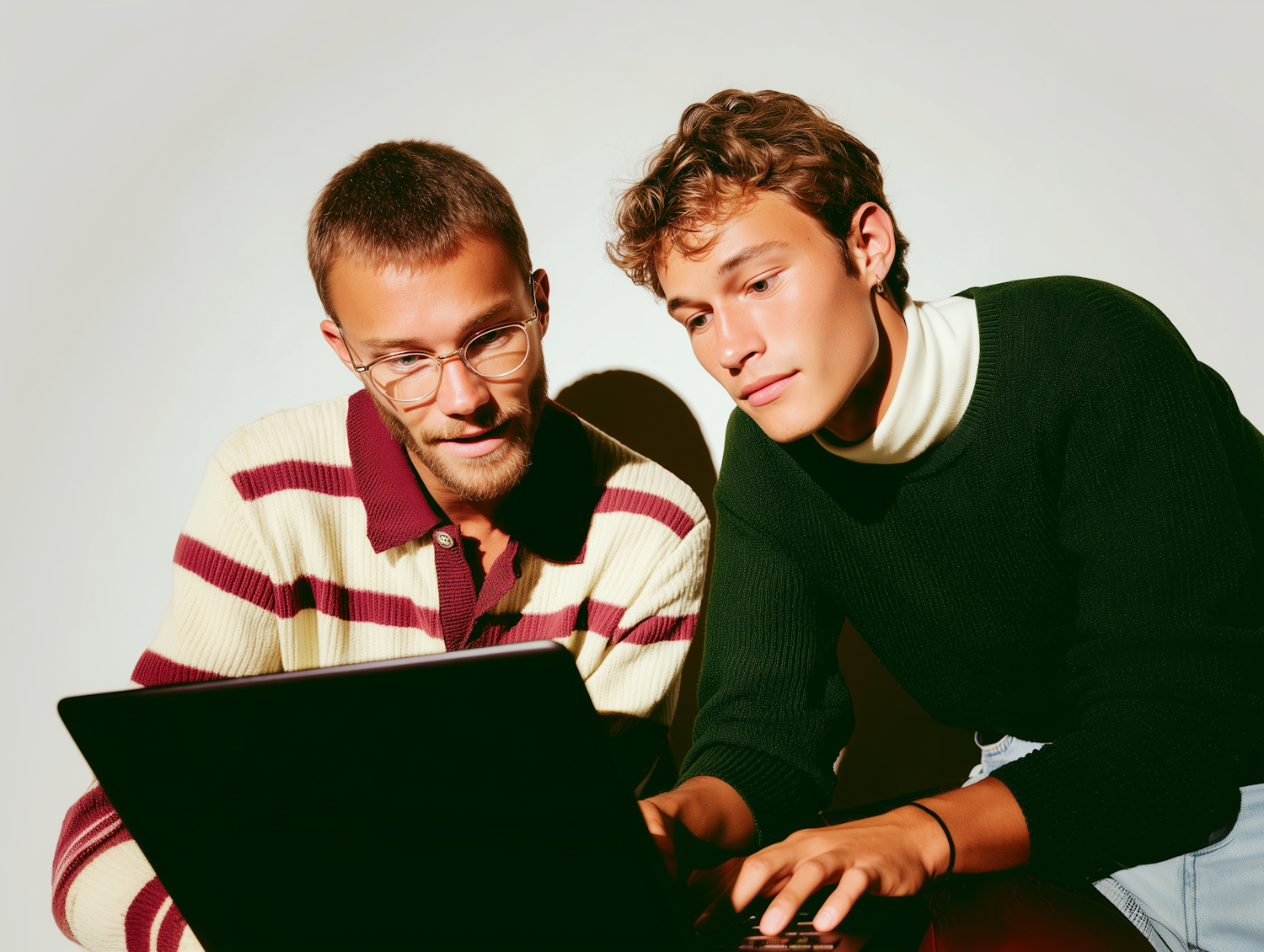 Two young men collaborate on a laptop, one typing while the other observes, in a bright, minimalistic setting.