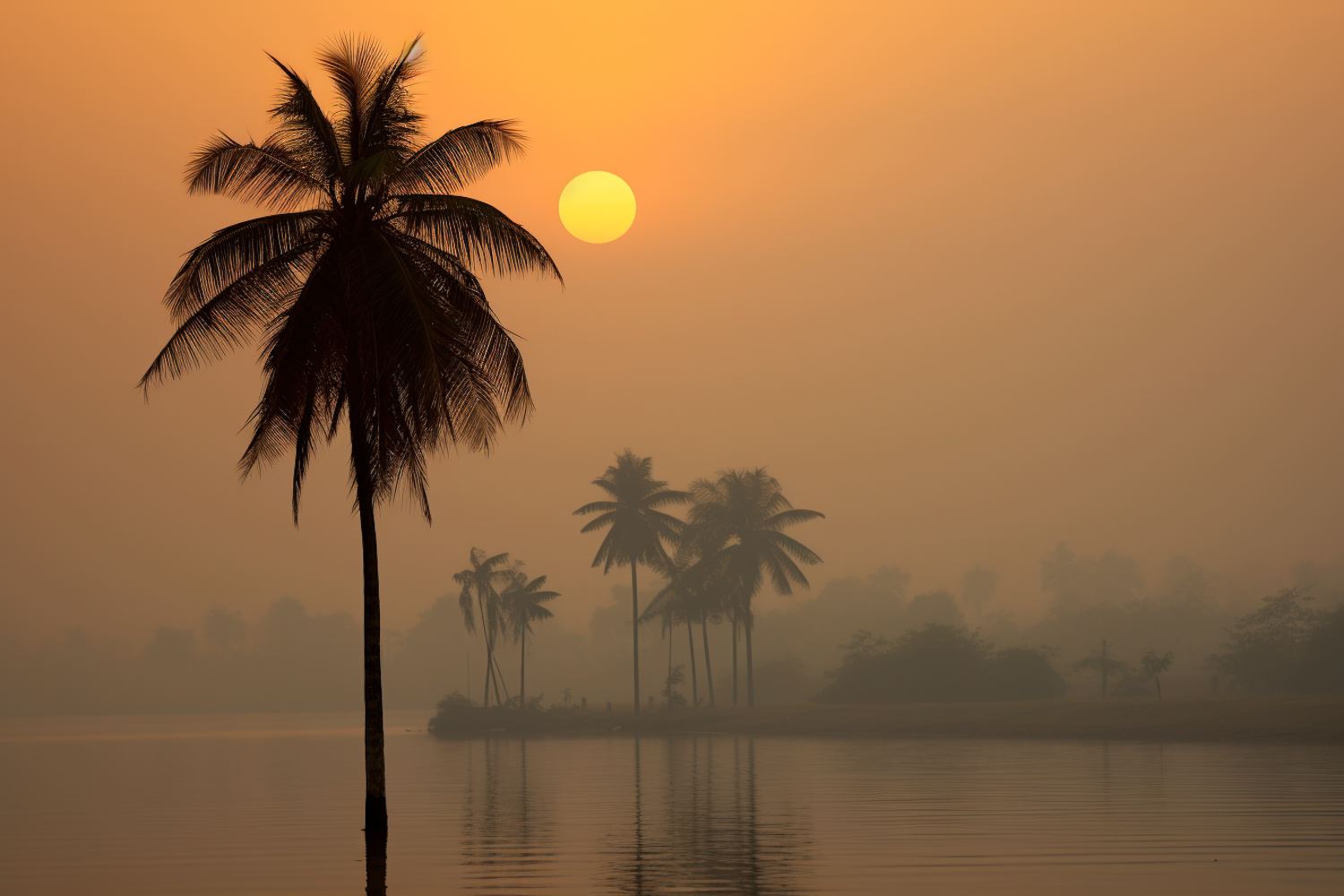 Serene tropical sunset with silhouetted palm trees and a warm orange sky reflecting on calm waters.