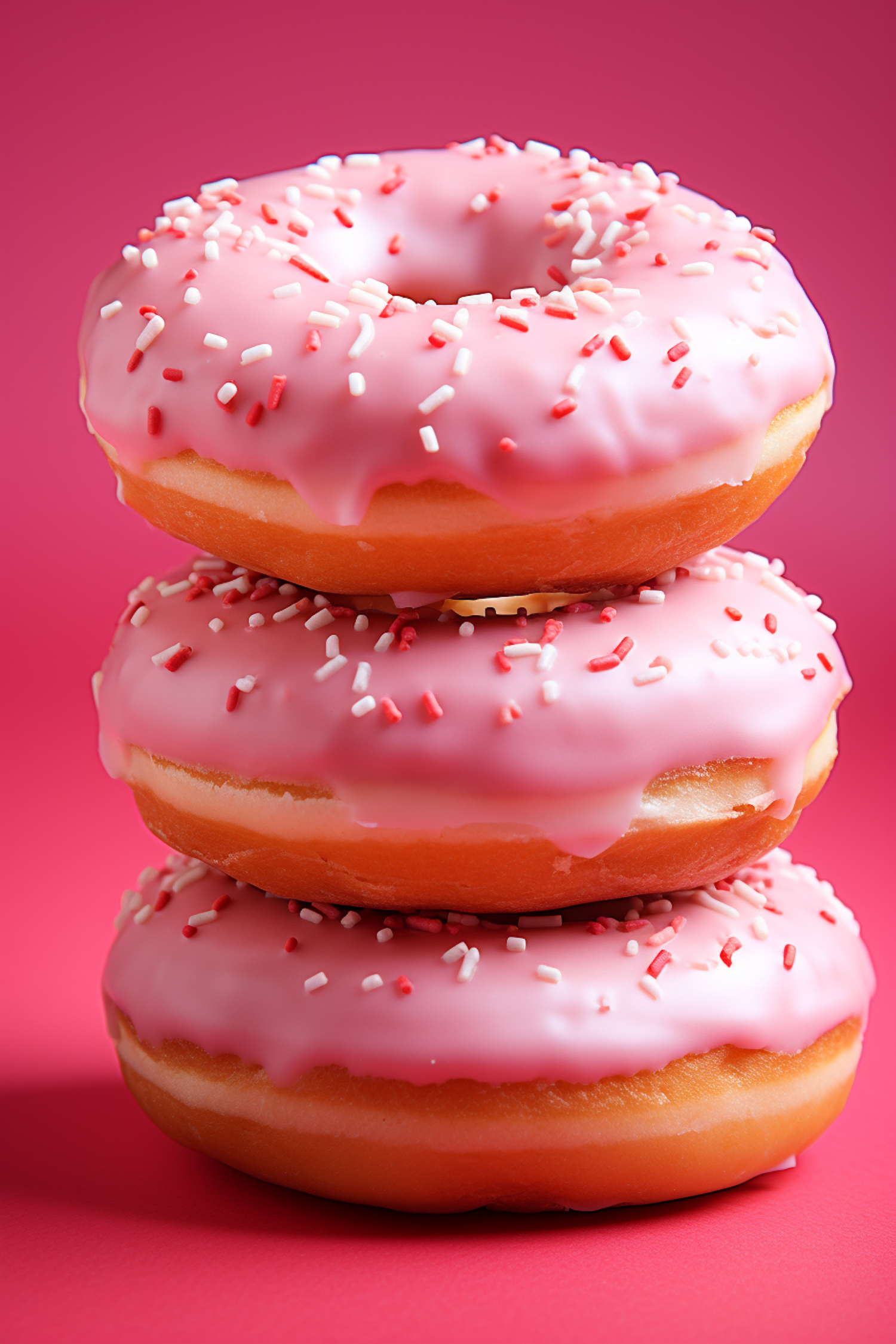 Stack of three pink frosted donuts with sprinkles on a vibrant pink background, creating a colorful and appetizing scene.