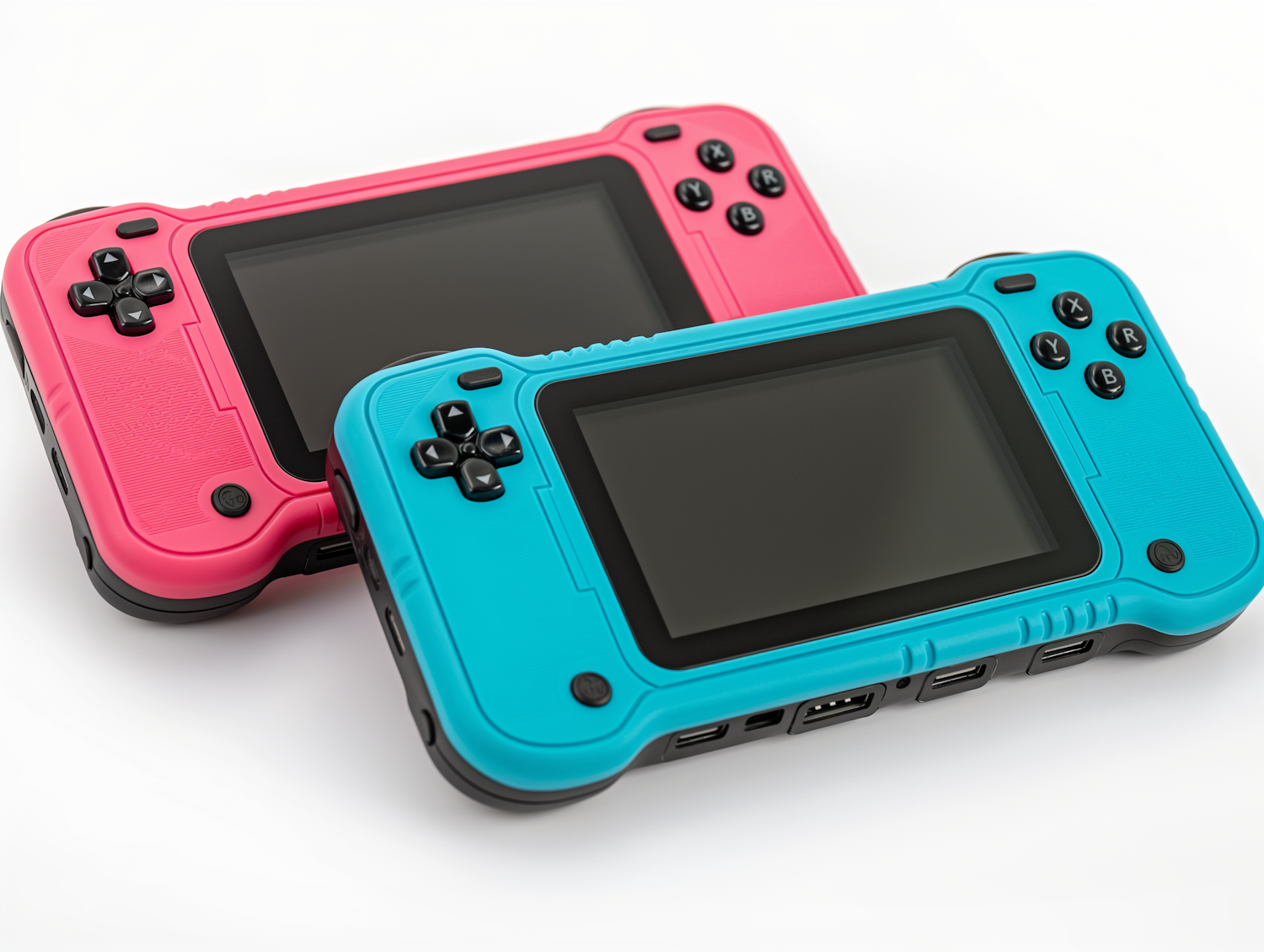 Two vibrant handheld gaming consoles in turquoise and pink with ergonomic design and button layout on a white background.