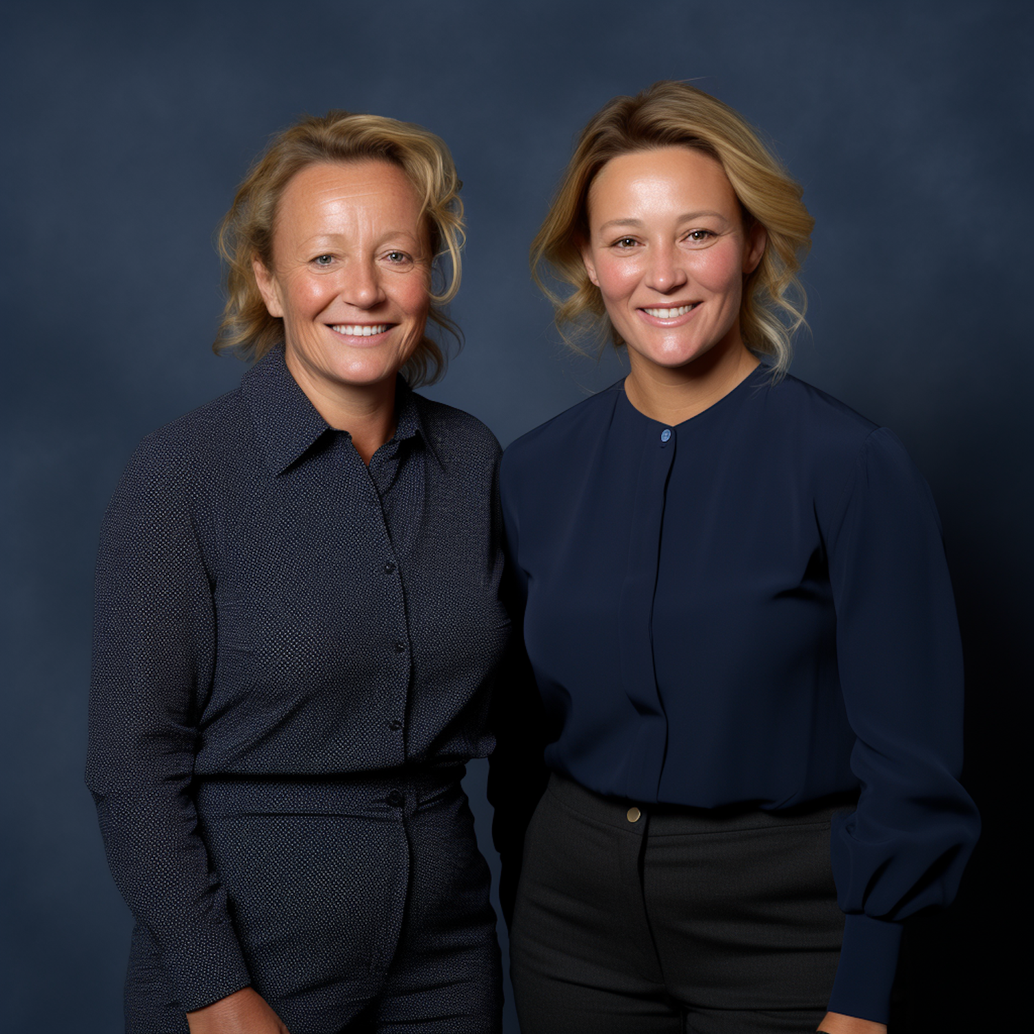 Two blonde women in navy outfits smiling warmly against a dark blue background, showcasing a friendly and professional vibe.