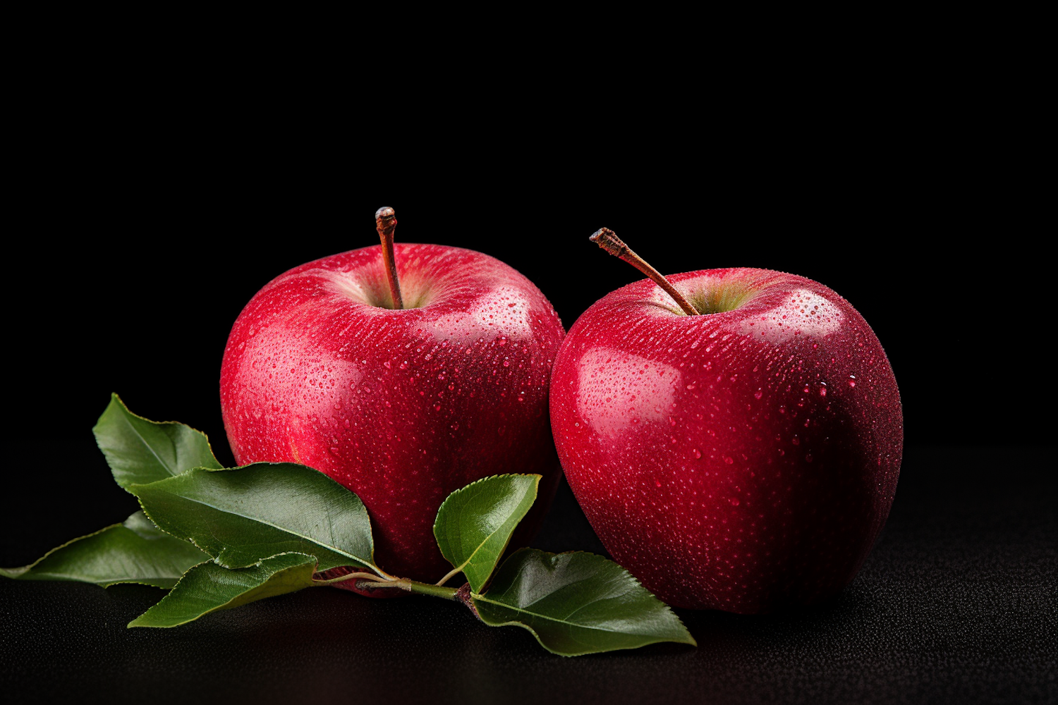 Two fresh red apples with water droplets and green leaves on a black background, highlighting their vibrant color and glossy texture.