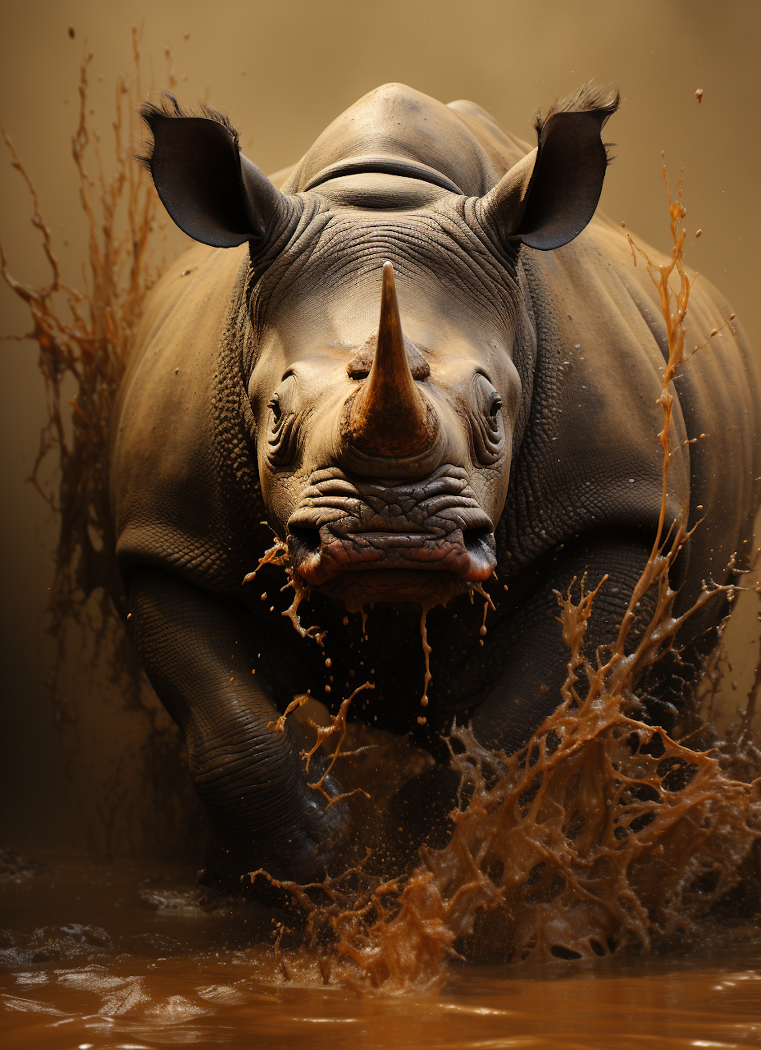 A dynamic image of a charging rhinoceros splashing through mud, showcasing its strength and power in a dramatic, earthy setting.