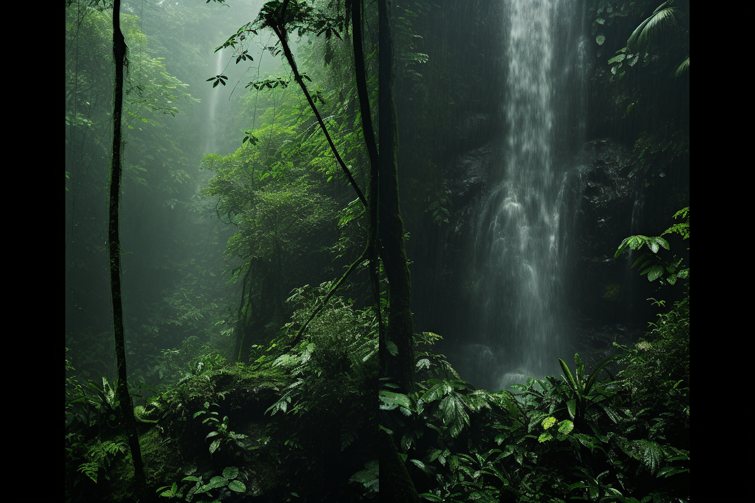 Lush rainforest with a cascading waterfall, surrounded by dense green foliage and mist, creating a serene and mystical atmosphere.