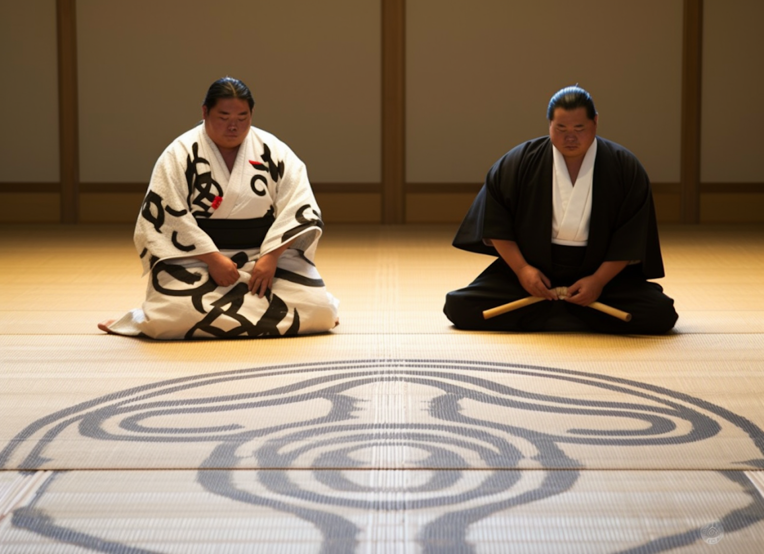 Two men in traditional kimonos sit on a tatami mat, exuding calm and focus in a minimalist setting.