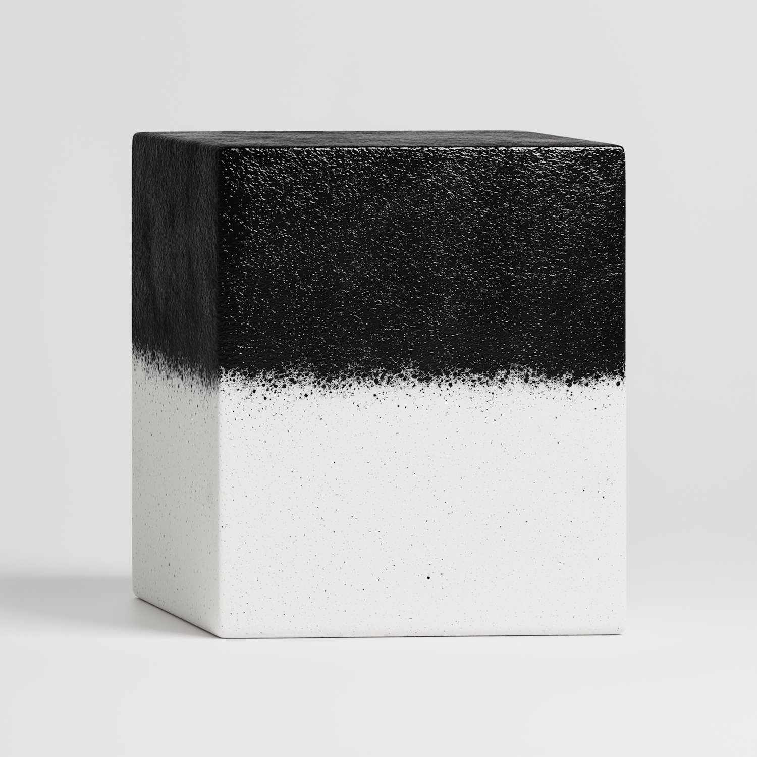 Textured black and white cube with gradient transition, set against a light gray background, highlighting its geometric shape.