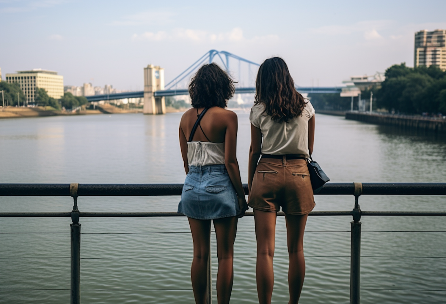 Two women stand by a river, gazing at a blue bridge, with urban scenery in the background. Casual summer attire and relaxed atmosphere.