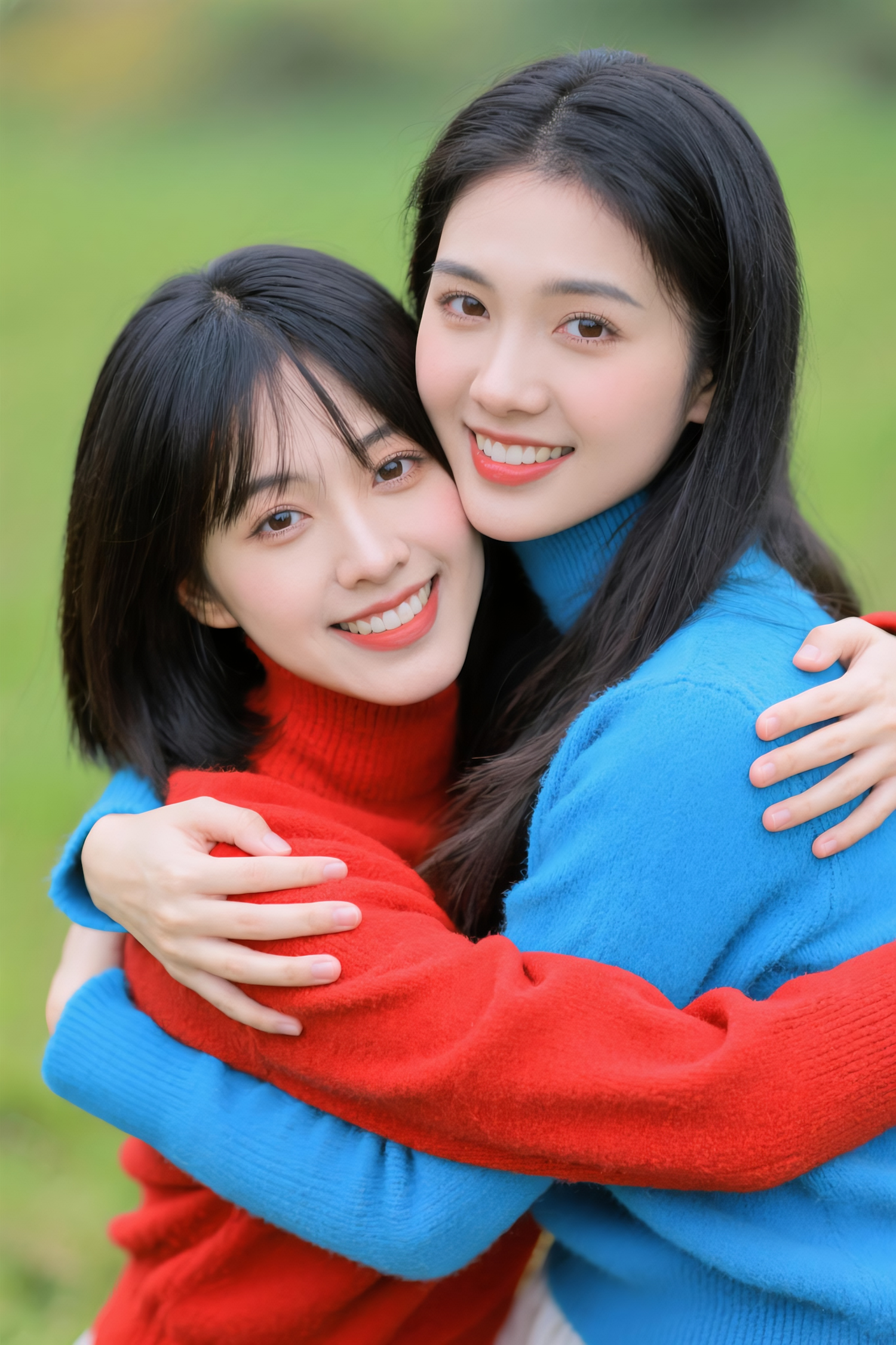 Two friends in colorful sweaters share a warm embrace outdoors, radiating joy and friendship against a lush green backdrop.