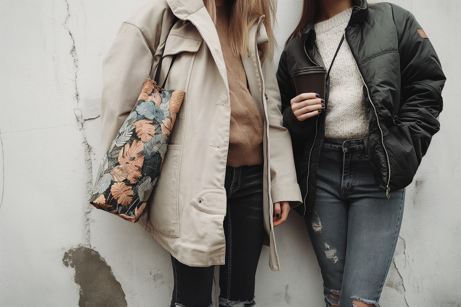 Two stylish women in casual outfits, one with a leaf-patterned tote, the other holding a coffee cup, stand against a textured wall.