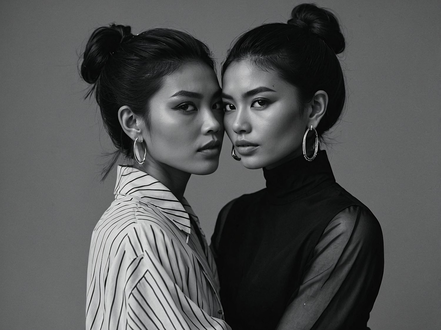 Two Asian women with elegant hoop earrings pose closely in a monochrome setting, wearing a striped shirt and a sheer black top.