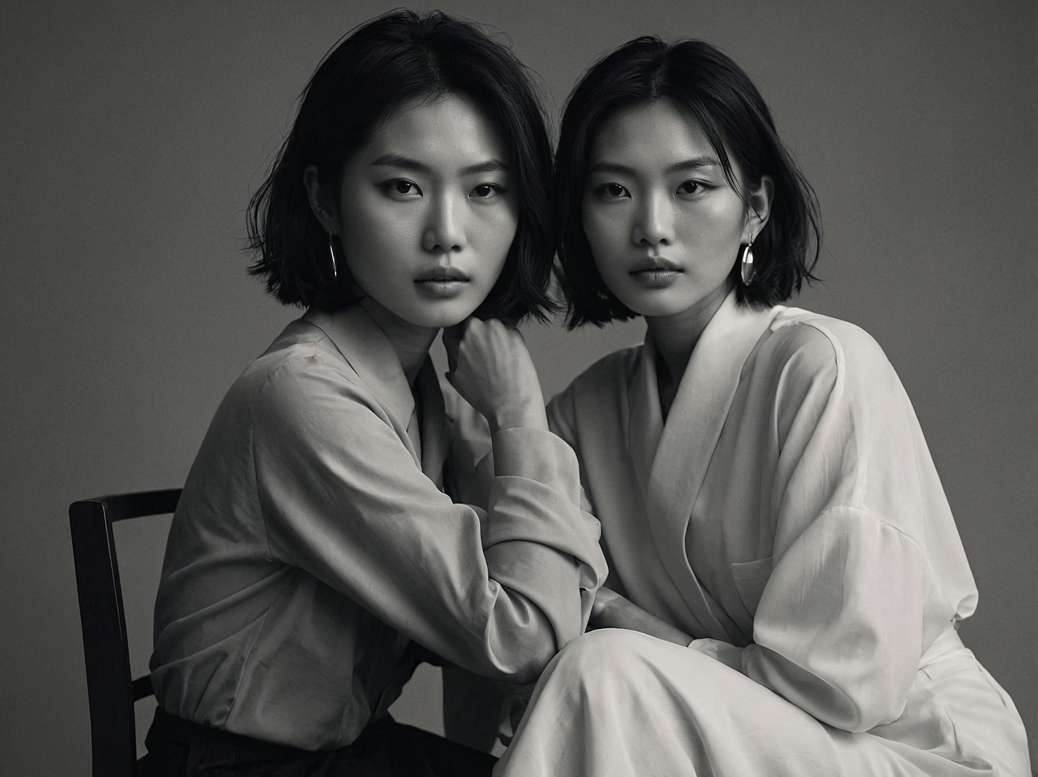 Elegant black-and-white portrait of two Asian women with short hair, hoop earrings, and serene expressions, exuding intimacy and connection.