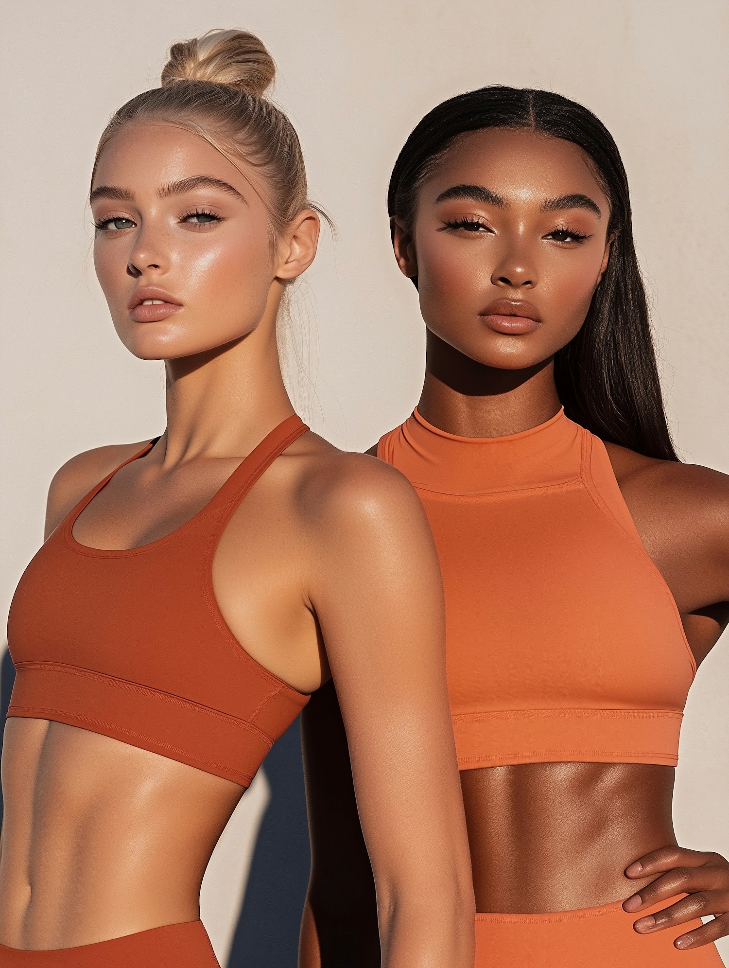 Two women in burnt orange sportswear pose confidently against a light background, showcasing elegance and athleticism.