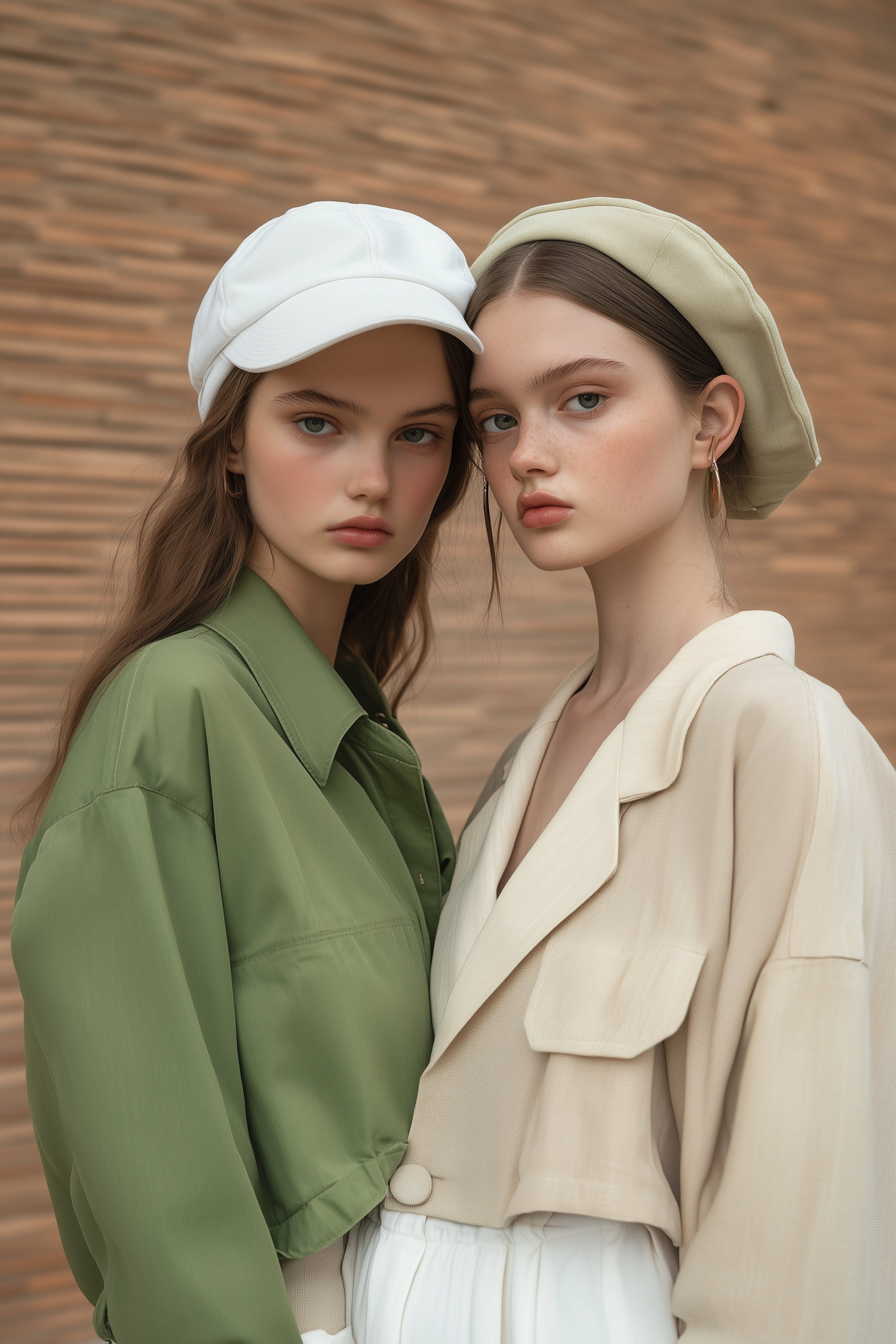 Two young women in stylish green and beige outfits pose against a textured wall, exuding elegance and modern fashion.