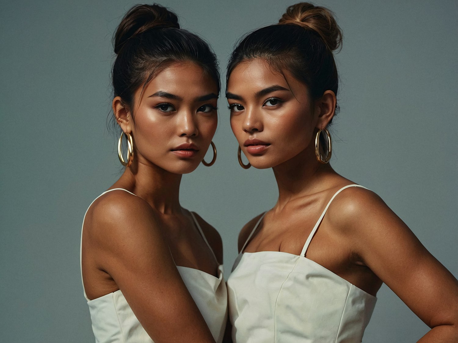 Two Asian women with high buns and gold hoop earrings in white tops, posing confidently against a gray background.