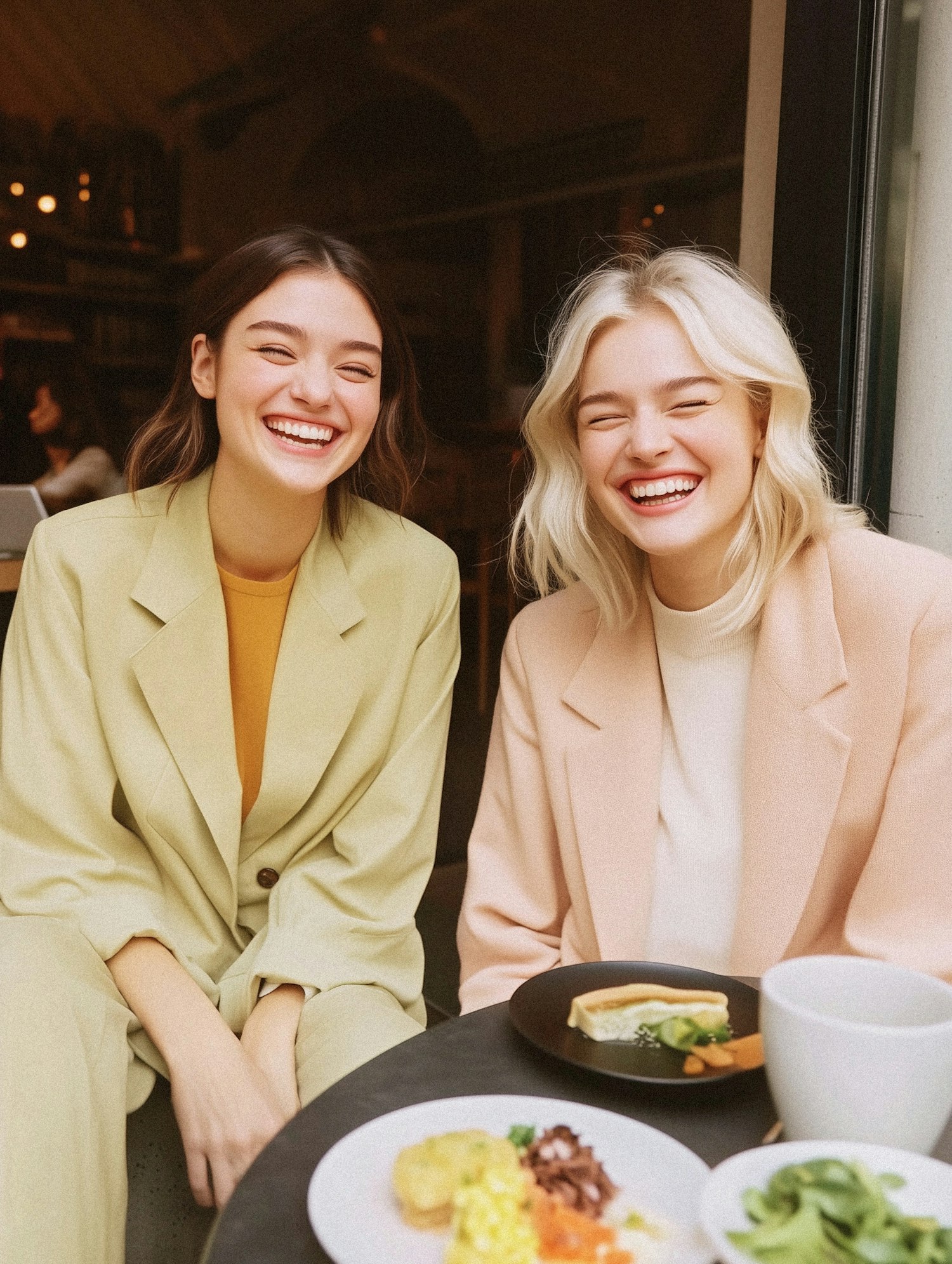 Two women in pastel suits share a joyful moment at a cafe, enjoying food and laughter. Bright smiles and cozy vibes fill the scene.