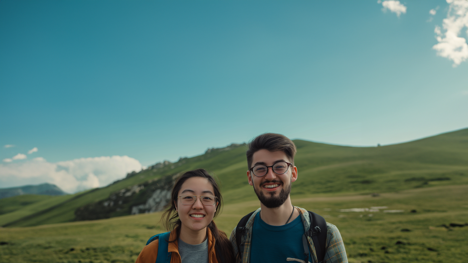 Smiling young couple in a scenic green landscape with rolling hills and a clear blue sky.