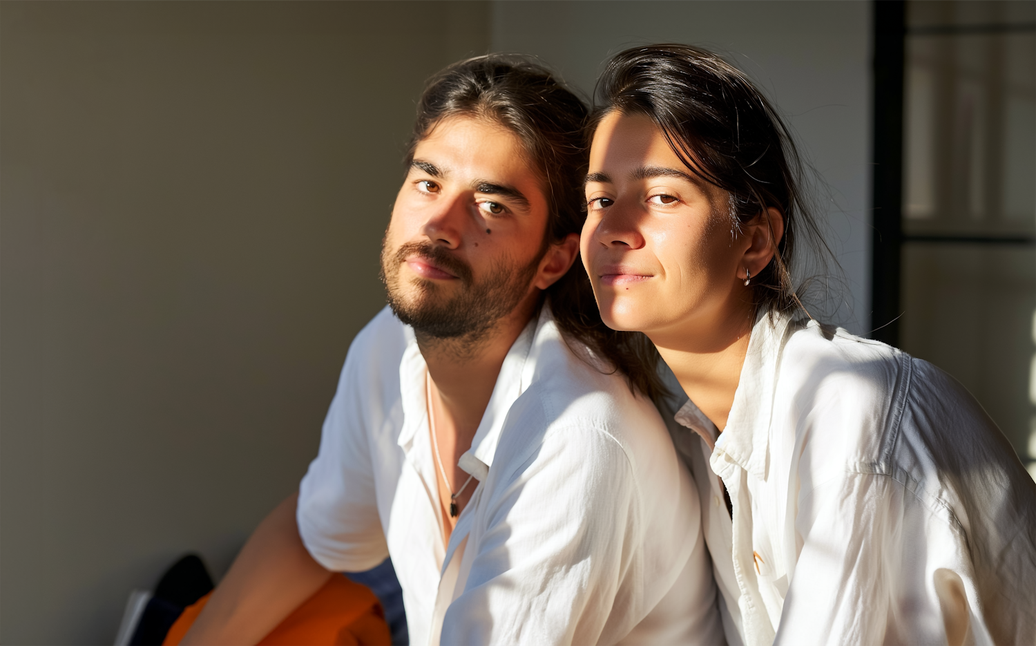 A couple in white shirts bathed in warm sunlight, creating a serene and intimate atmosphere with soft shadows and relaxed expressions.