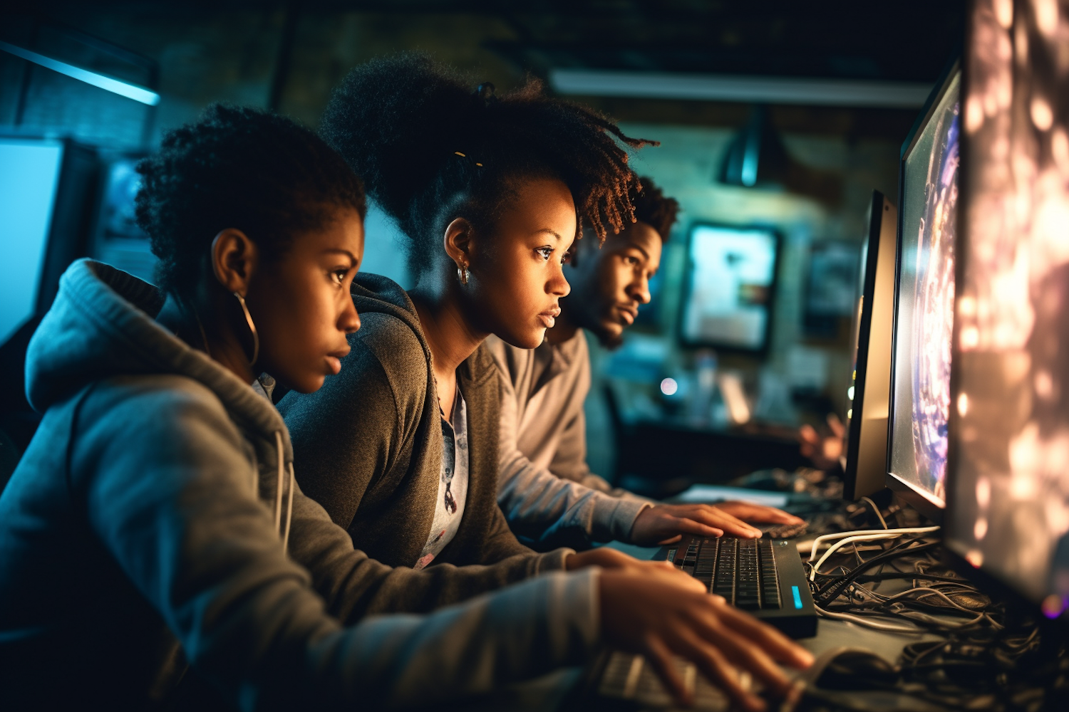Three young individuals focused on computer screens in a dimly lit room, creating a tech-driven atmosphere.