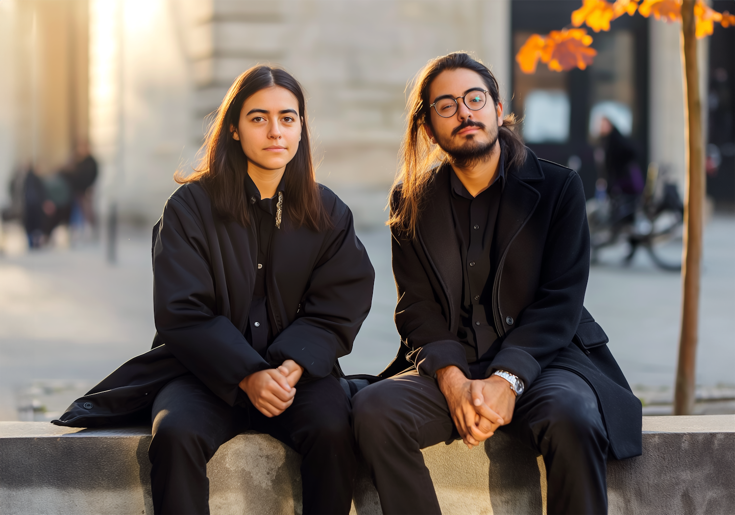 Two young adults in black coats sit on a bench in an urban setting, with autumn leaves in the background.