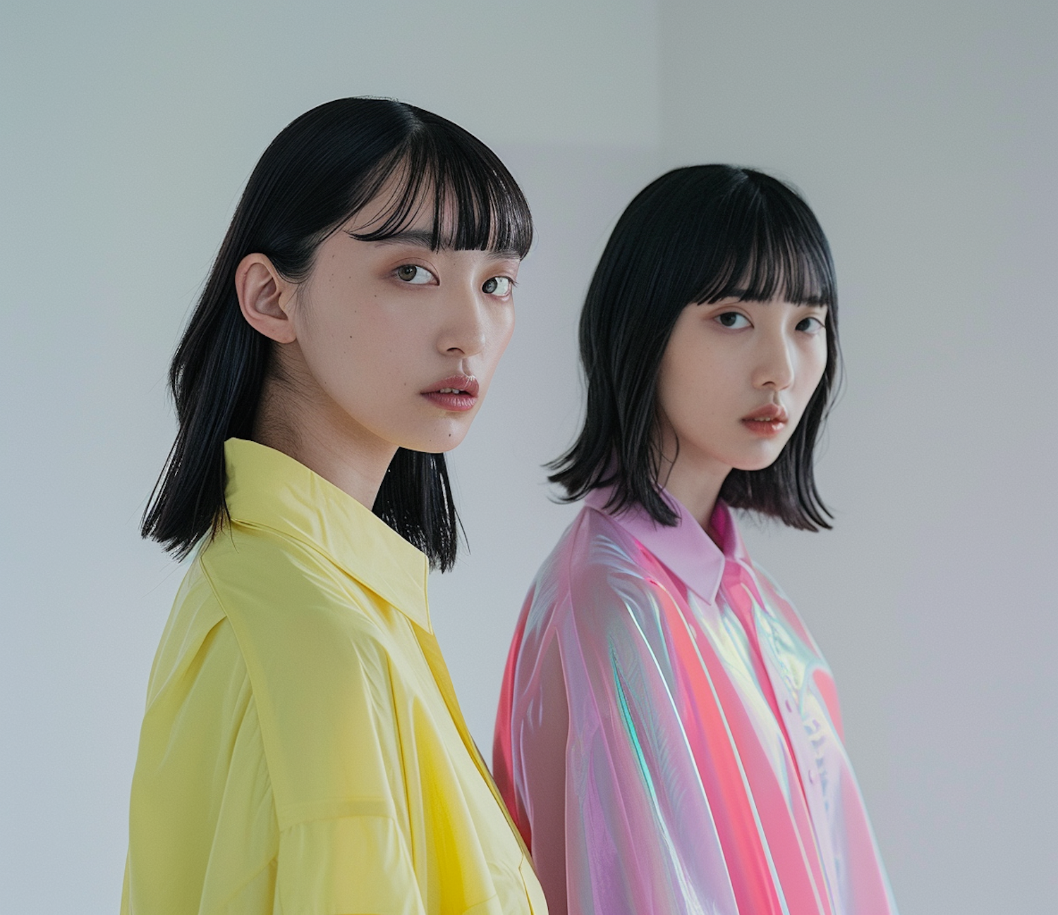 Two women in vibrant yellow and pink shirts pose with calm expressions against a minimalist background.
