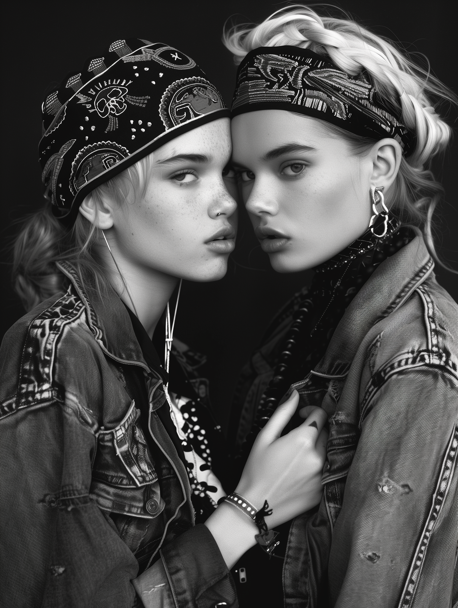 Two young women in denim jackets and bandanas pose closely in a monochrome portrait, showcasing edgy fashion and accessories.
