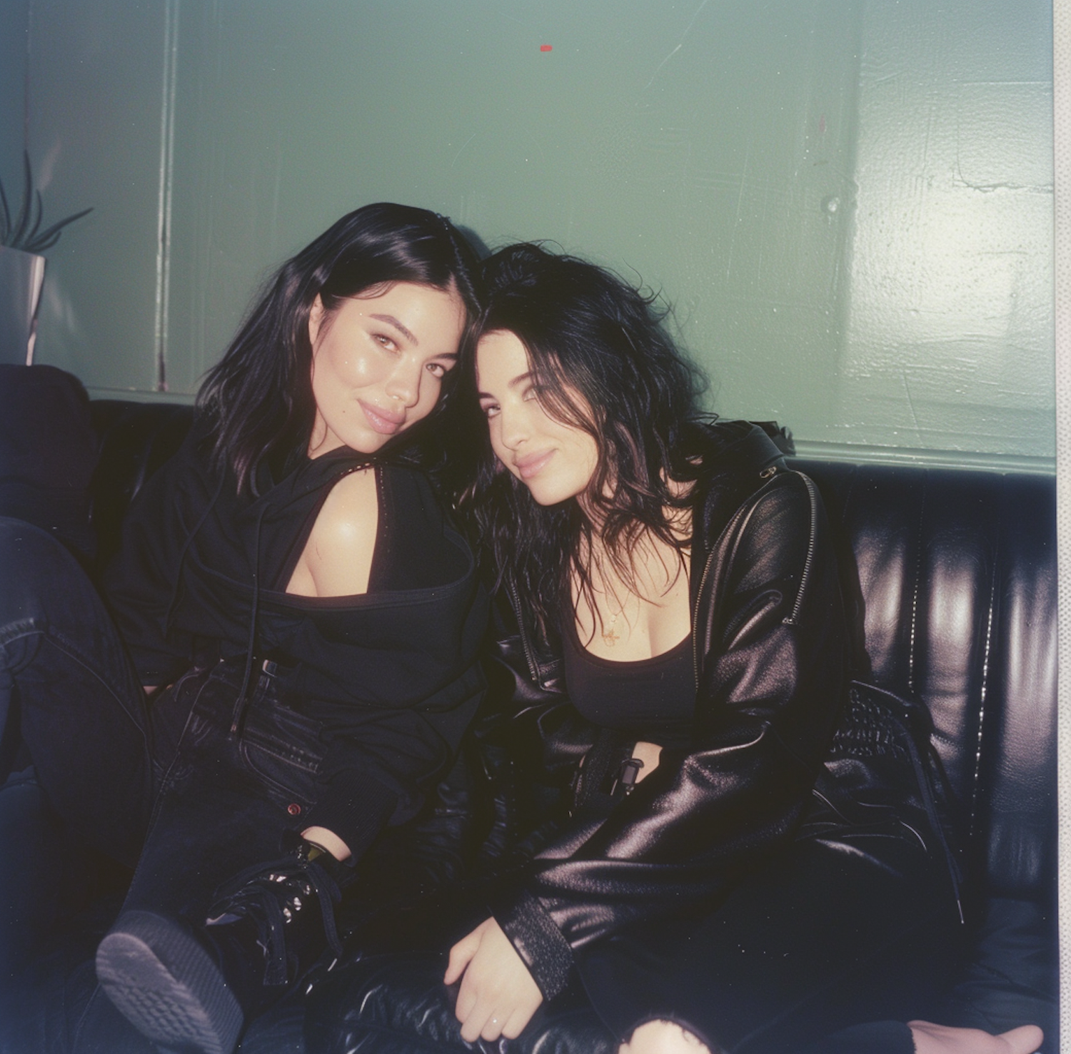 Two young women in black outfits sit closely on a leather couch, smiling warmly against a light green wall.