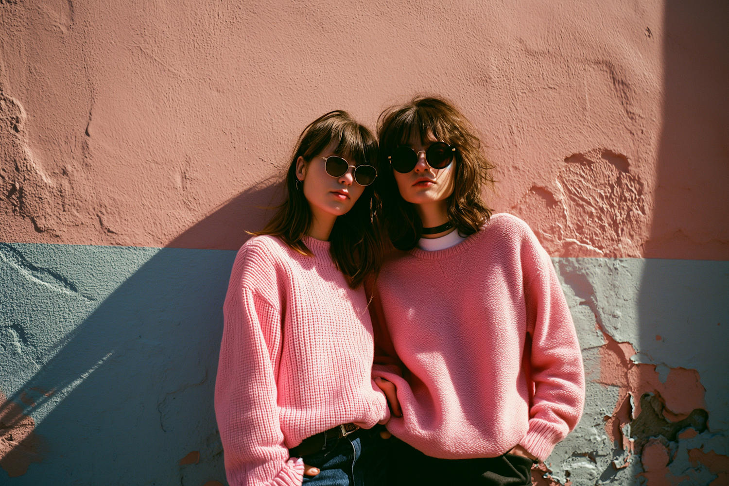 Two stylish women in pink sweaters and sunglasses pose against a pastel pink and blue wall, exuding a retro and casual vibe.