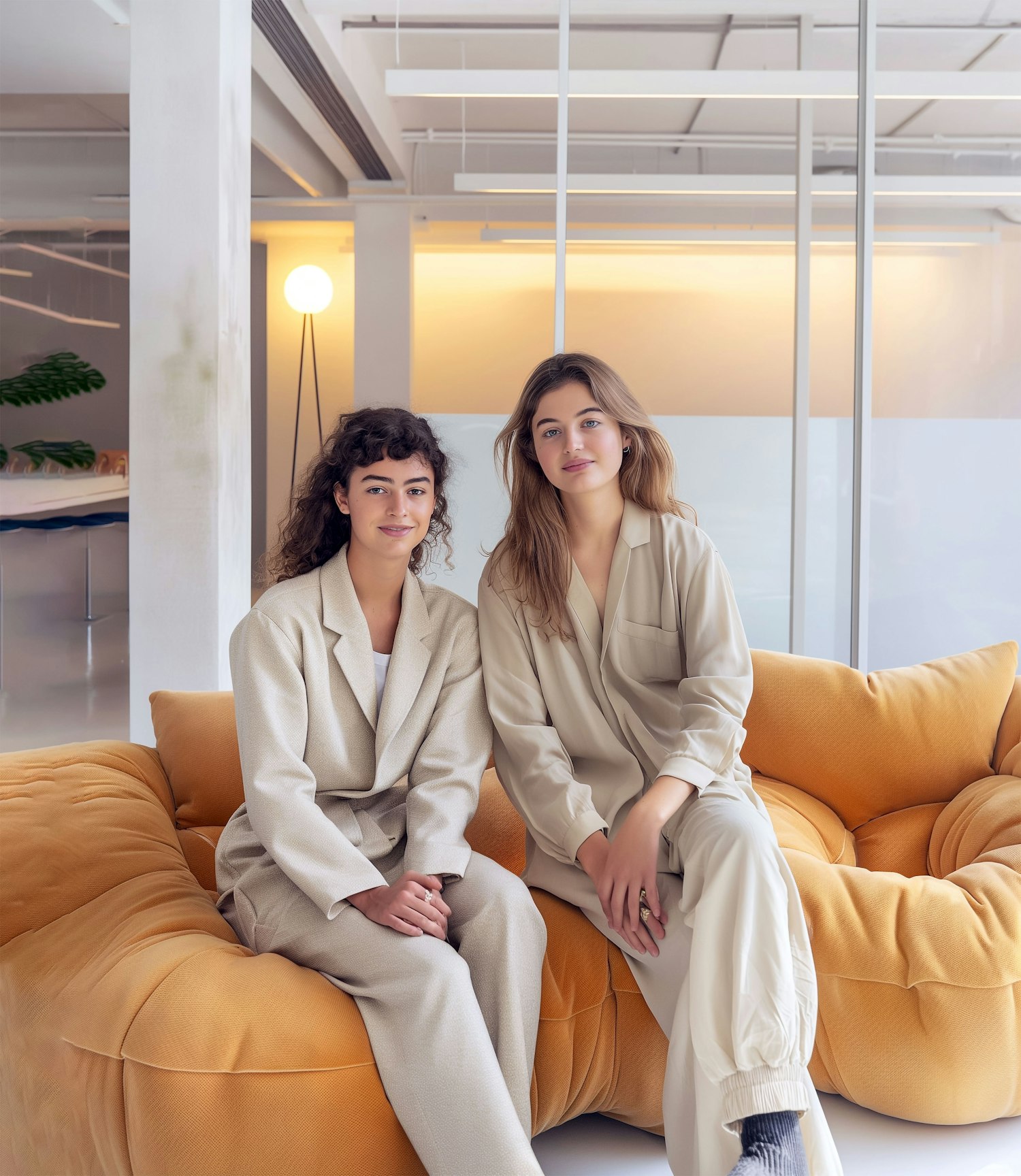 Two women in beige outfits sit on a mustard sofa in a modern office, exuding elegance and style.