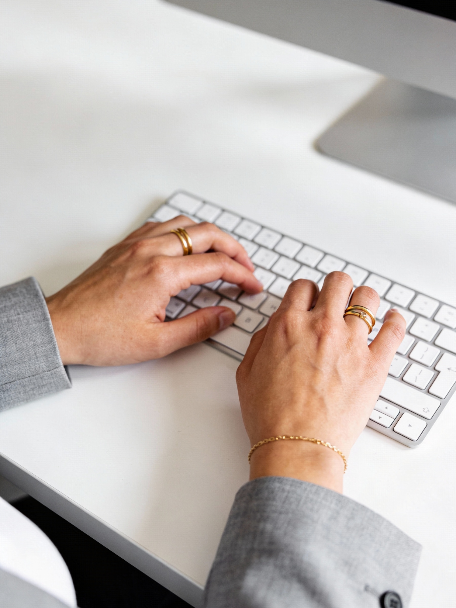 Close-up of hands typing on a white keyboard, wearing gold jewelry, in a clean and modern workspace.