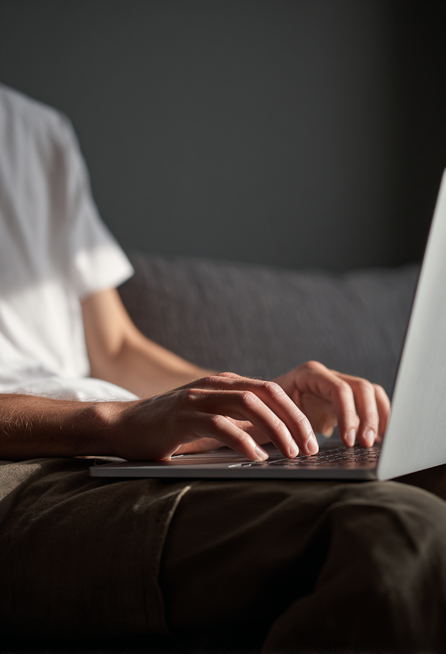 A person typing on a laptop in soft natural lighting, their hands in focus. A relaxed setting with casual clothing and a cozy background.
