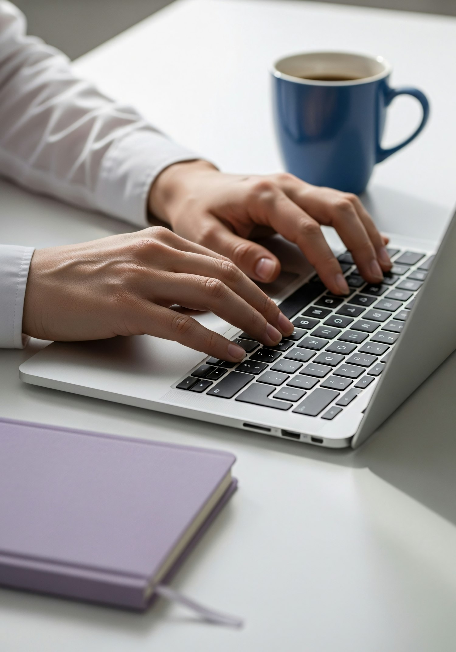 Hands typing on a laptop keyboard, with a blue coffee mug and a lavender notebook on a white desk.