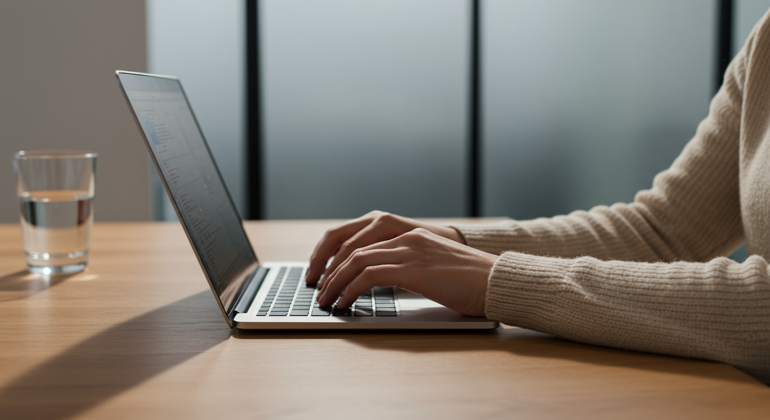 Hands typing on a laptop on a wooden desk with a glass of water nearby, set in a modern, softly lit workspace.