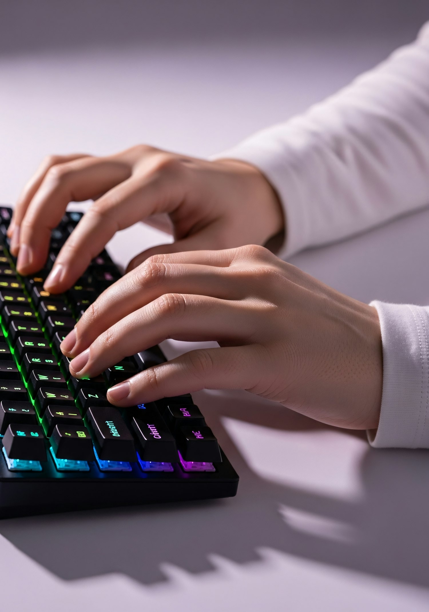 Hands typing on a colorful RGB mechanical keyboard, showcasing vibrant lighting and a sleek design in a minimalistic setting.
