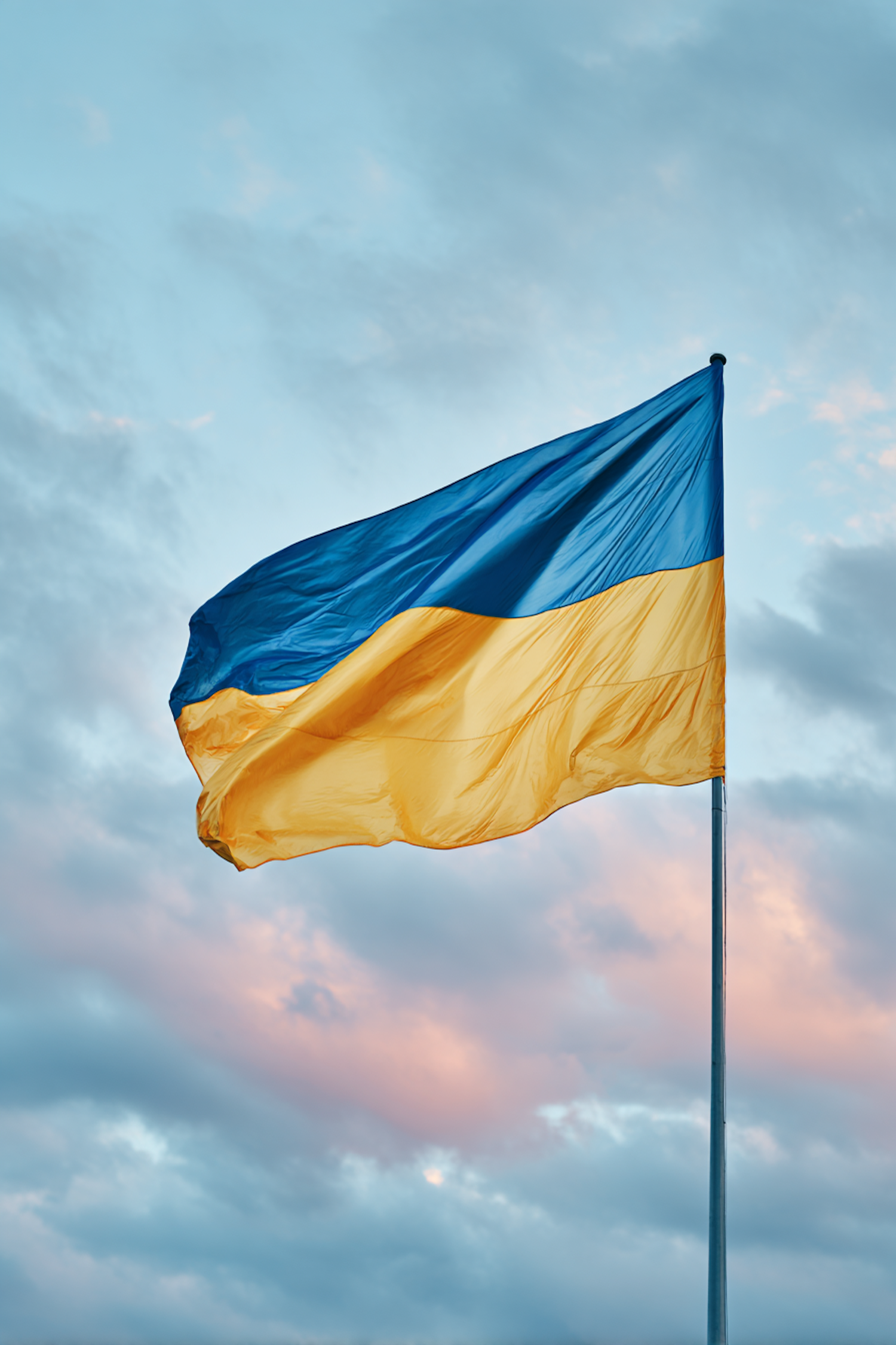 A vibrant Ukrainian flag waves brightly against a cloudy sky with hints of pink and blue, symbolizing peace and freedom.