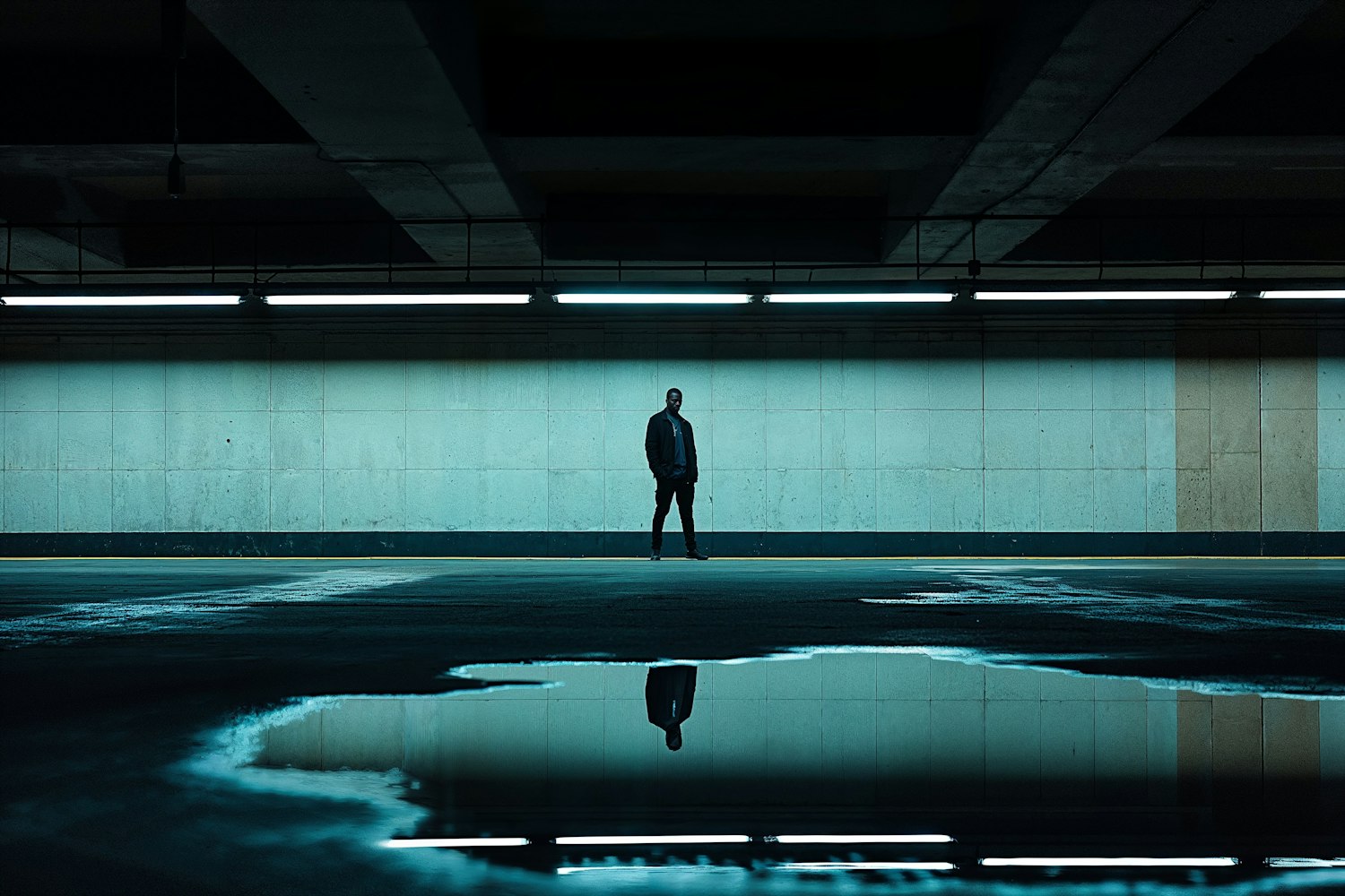 Moody underground parking garage scene with a lone figure standing, reflected in a puddle under cold fluorescent lighting.