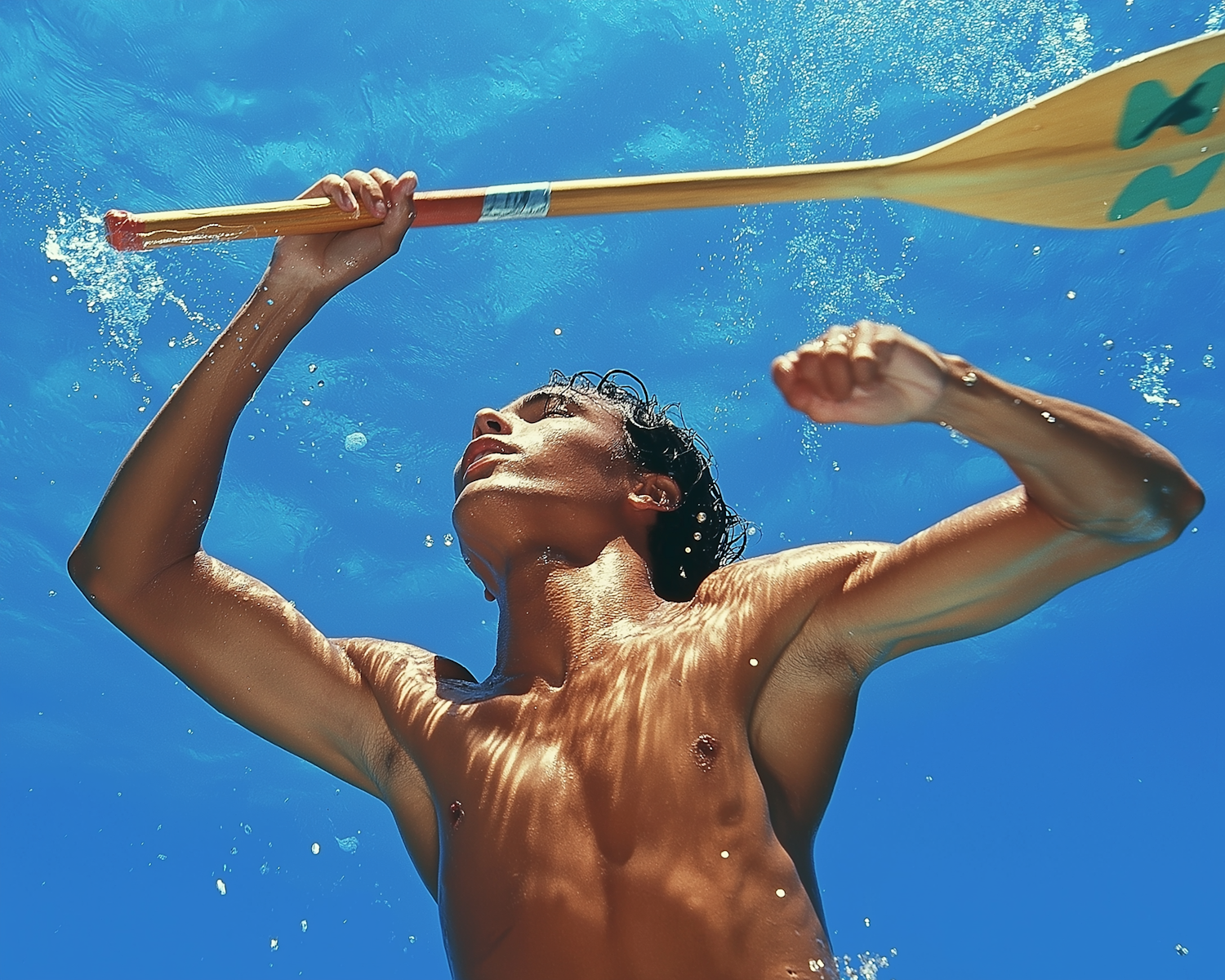 Dynamic shot of a young man holding a paddle, with water splashes and sunlight highlighting his muscular build against a blue sky.