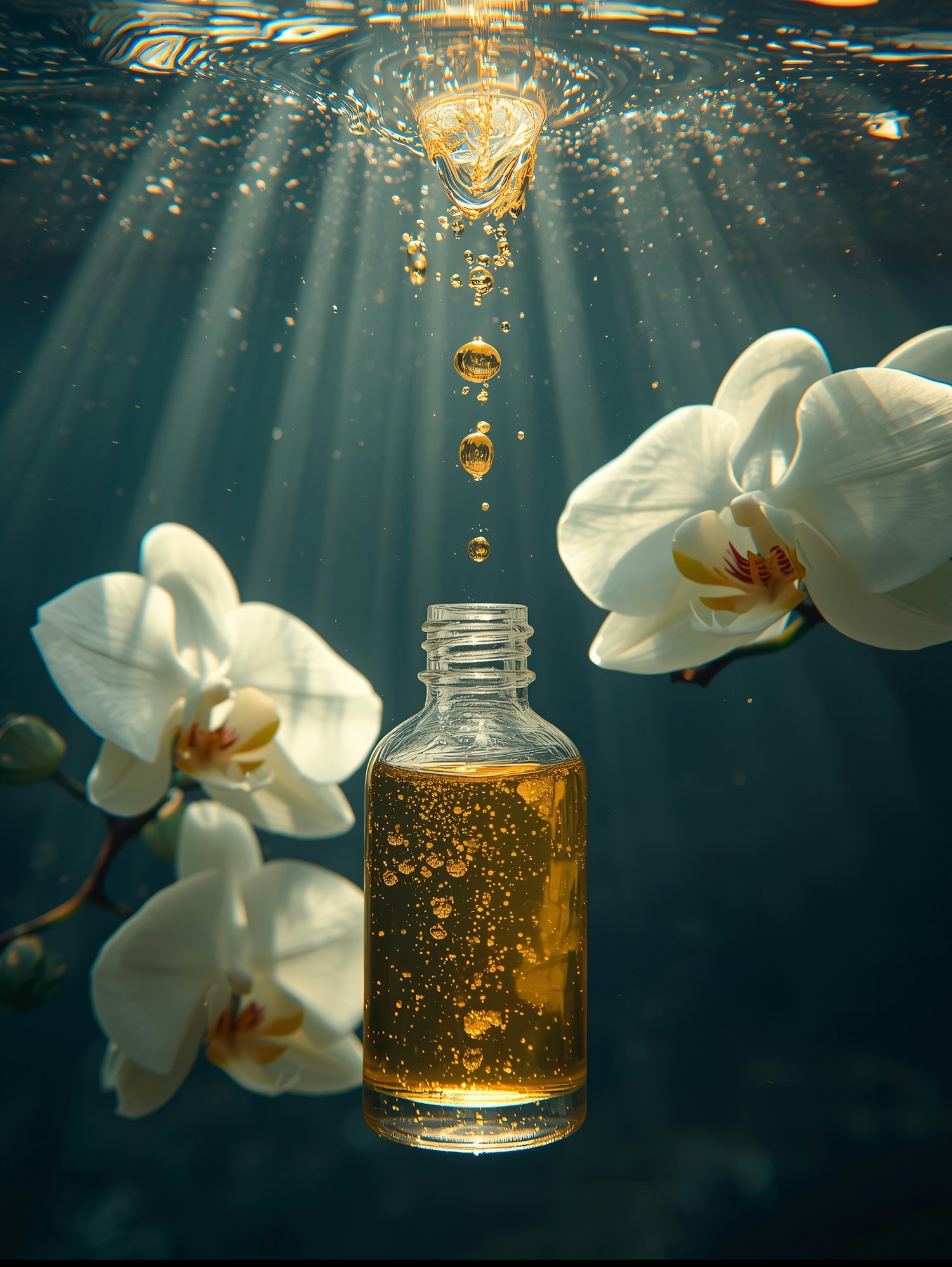 A golden liquid-filled bottle underwater, surrounded by white orchids and illuminated by sunlight, creating a serene and elegant scene.
