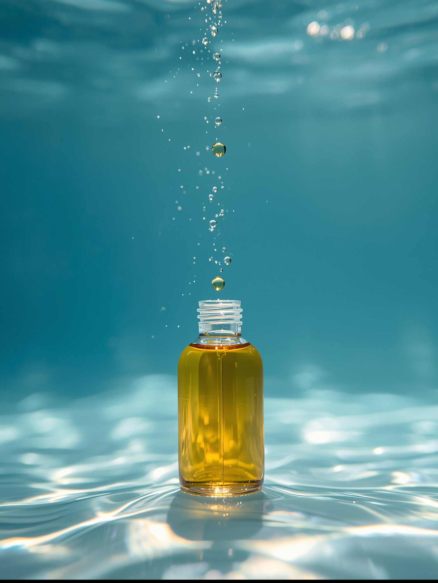 A golden liquid-filled bottle submerged in water, with rising bubbles and shimmering light reflections creating a serene underwater vibe.