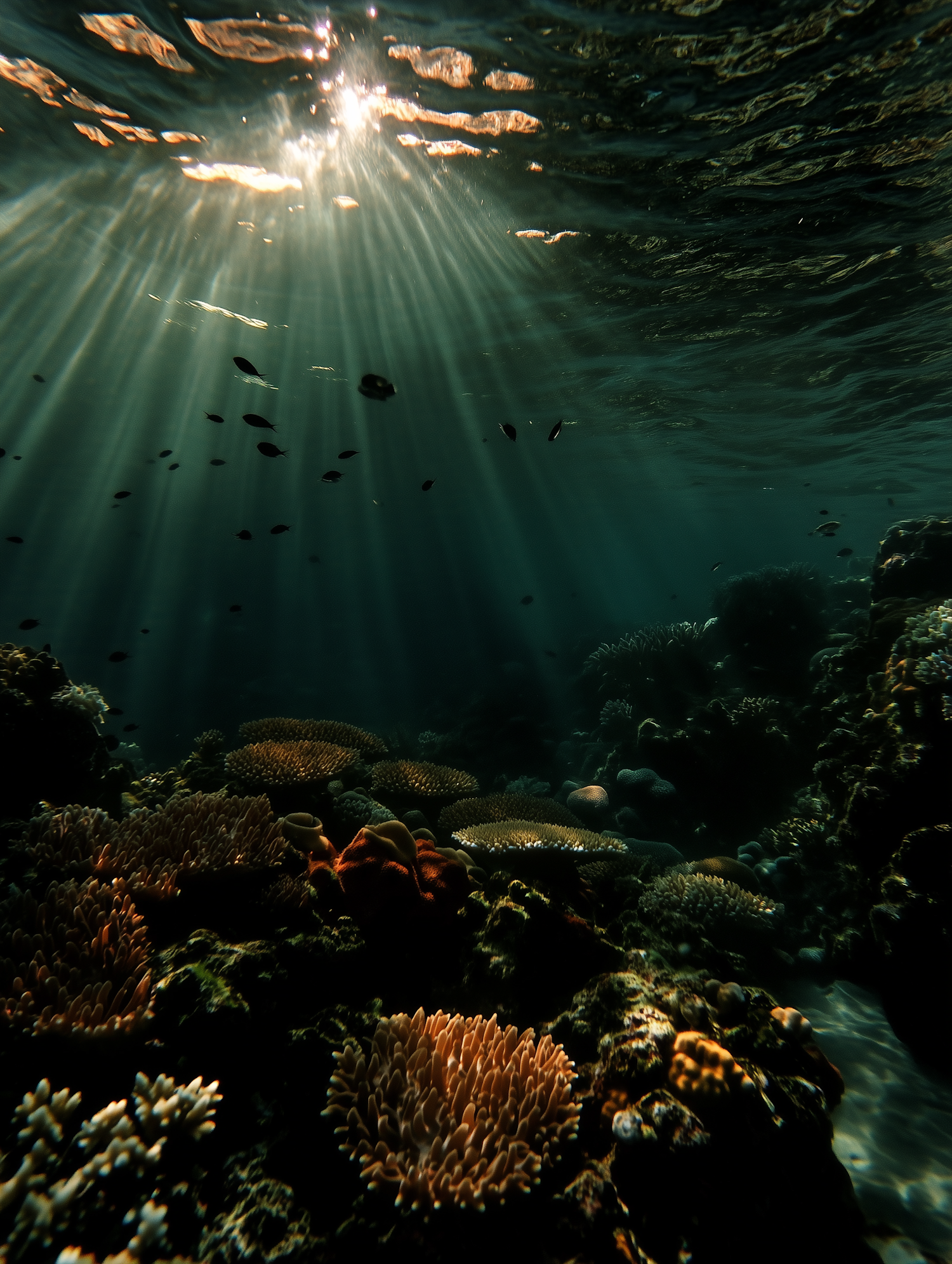 Sunlight streams through ocean water, illuminating a vibrant coral reef with colorful corals and small fish in a serene underwater scene.
