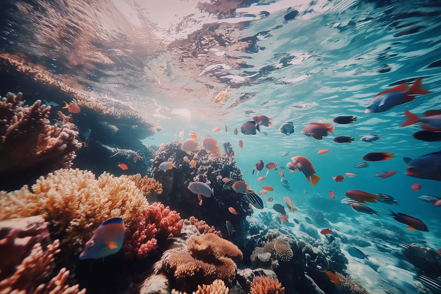 Vibrant underwater scene with colorful fish and corals, sunlight filtering through clear water, creating a serene marine atmosphere.