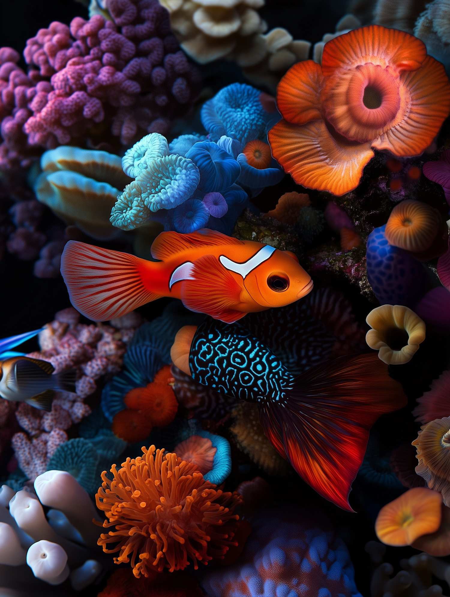 A vibrant underwater scene with a clownfish, colorful coral, and a striking patterned fish in a vivid marine ecosystem.
