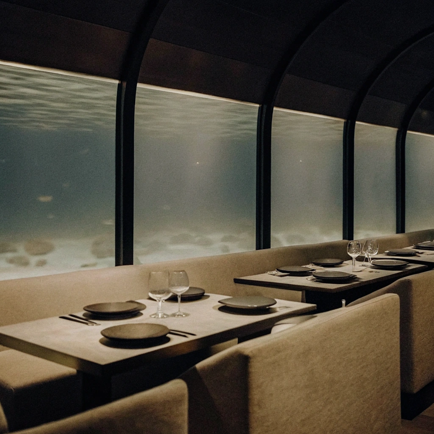 Elegant underwater restaurant with beige booths, black tableware, and large windows offering serene views of the underwater world.