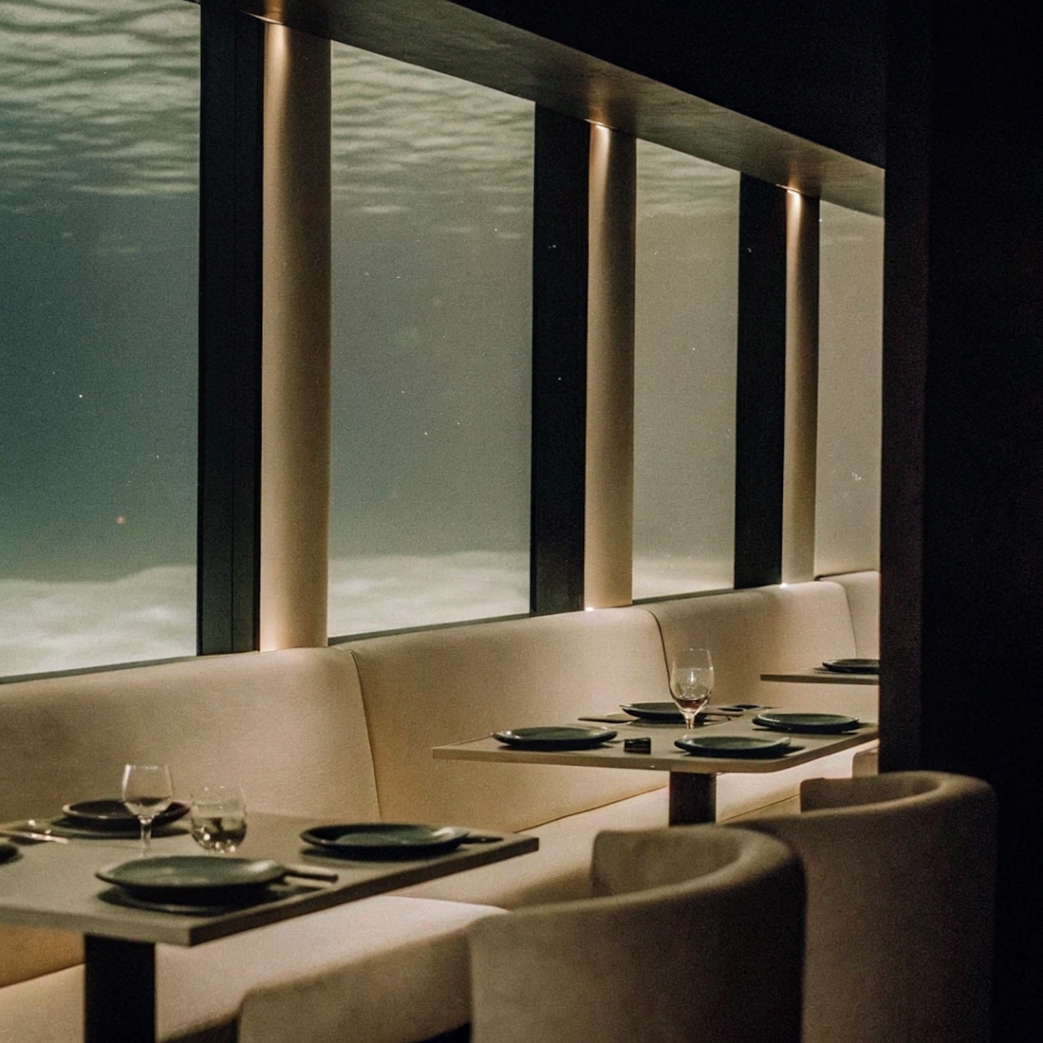 Elegant underwater restaurant with beige seating, black tableware, and serene aquatic views through large glass windows.