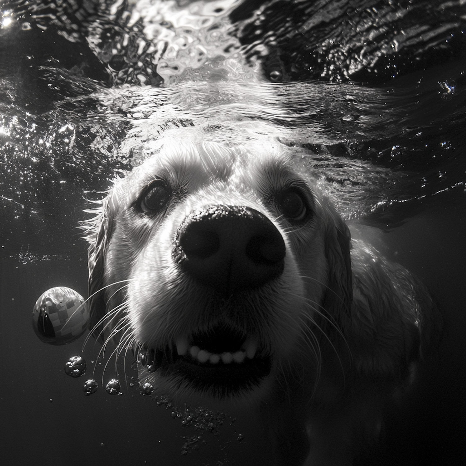 Black and white underwater shot of a golden retriever swimming with bubbles and a ball, creating a dynamic and playful scene.