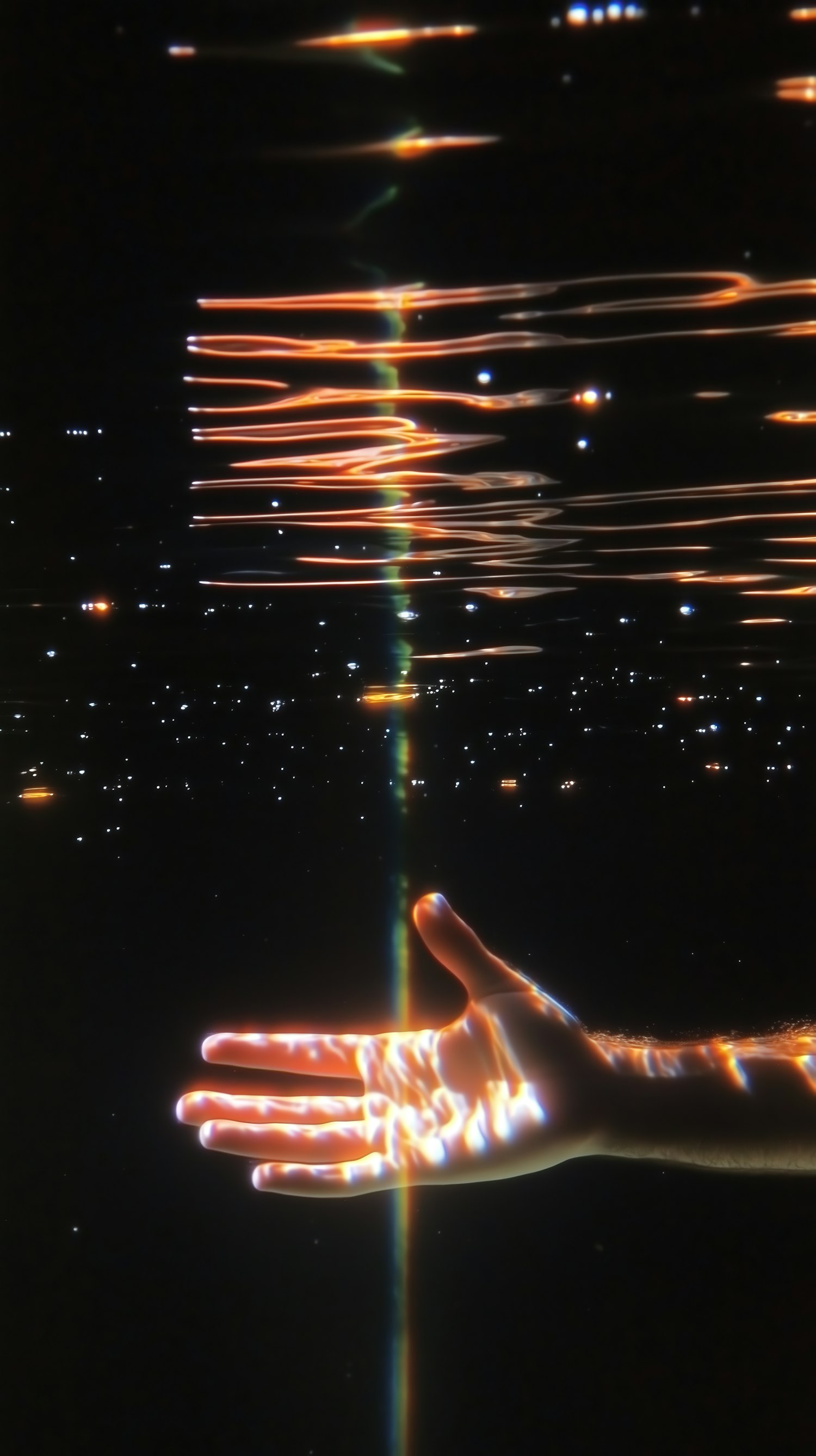 A surreal underwater hand illuminated by refracted light, with rippling water and cosmic-like reflections in a dark, dreamlike setting.