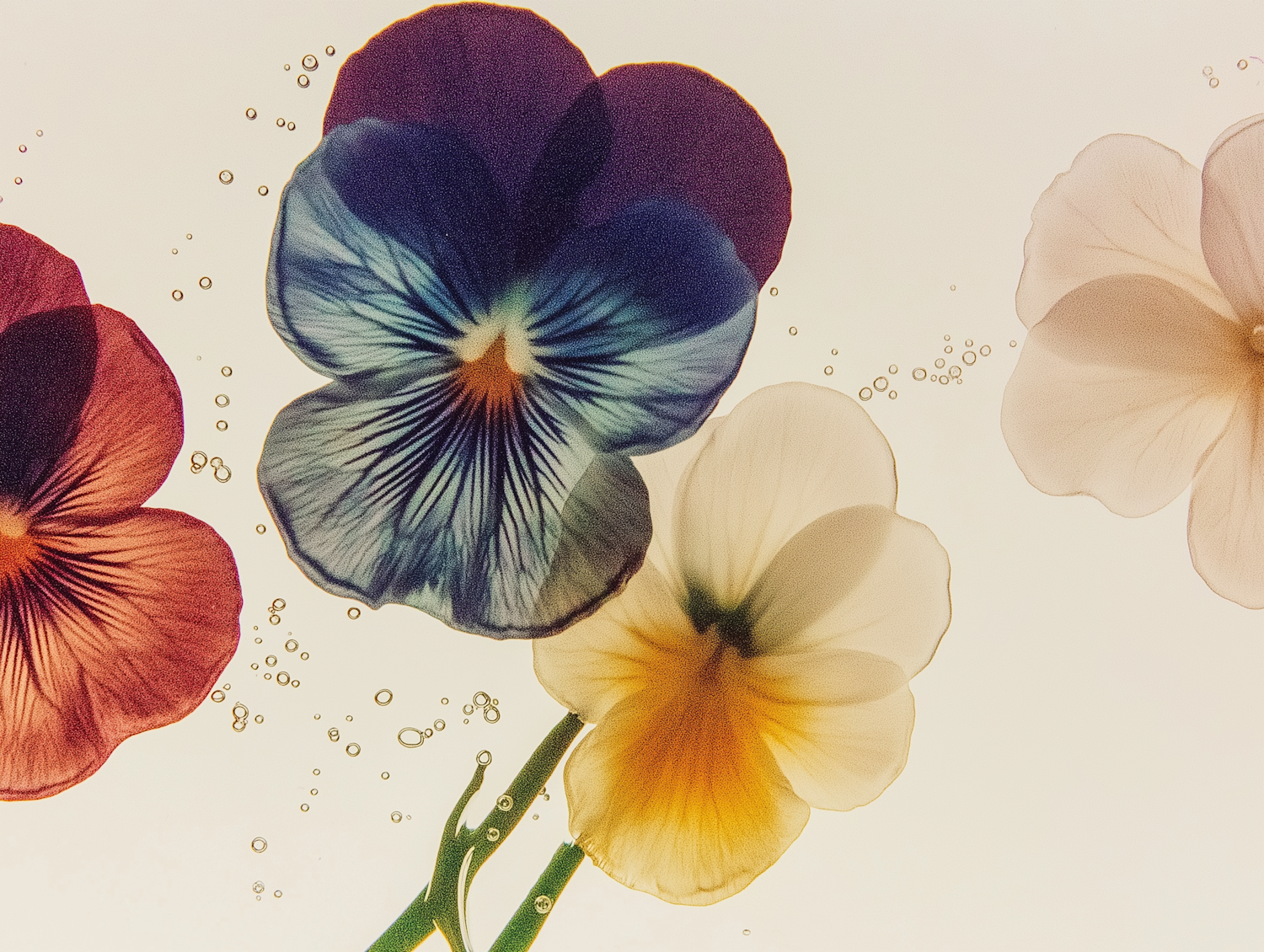 Vivid pansy flowers submerged in water, showcasing intricate petal patterns and vibrant colors with scattered air bubbles.