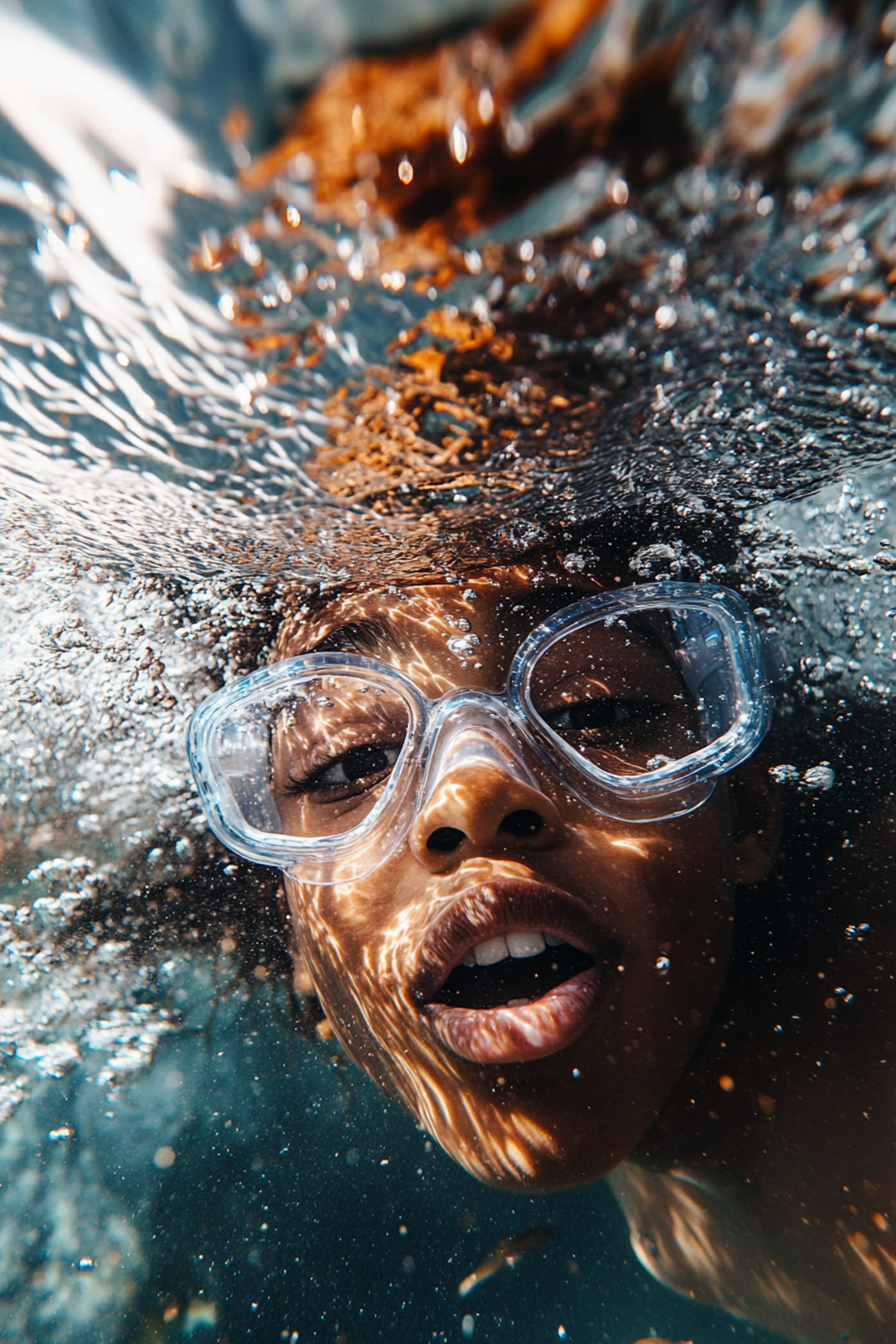 Underwater close-up of a young swimmer with goggles, curly hair, and sunlight creating shimmering patterns in clear water.